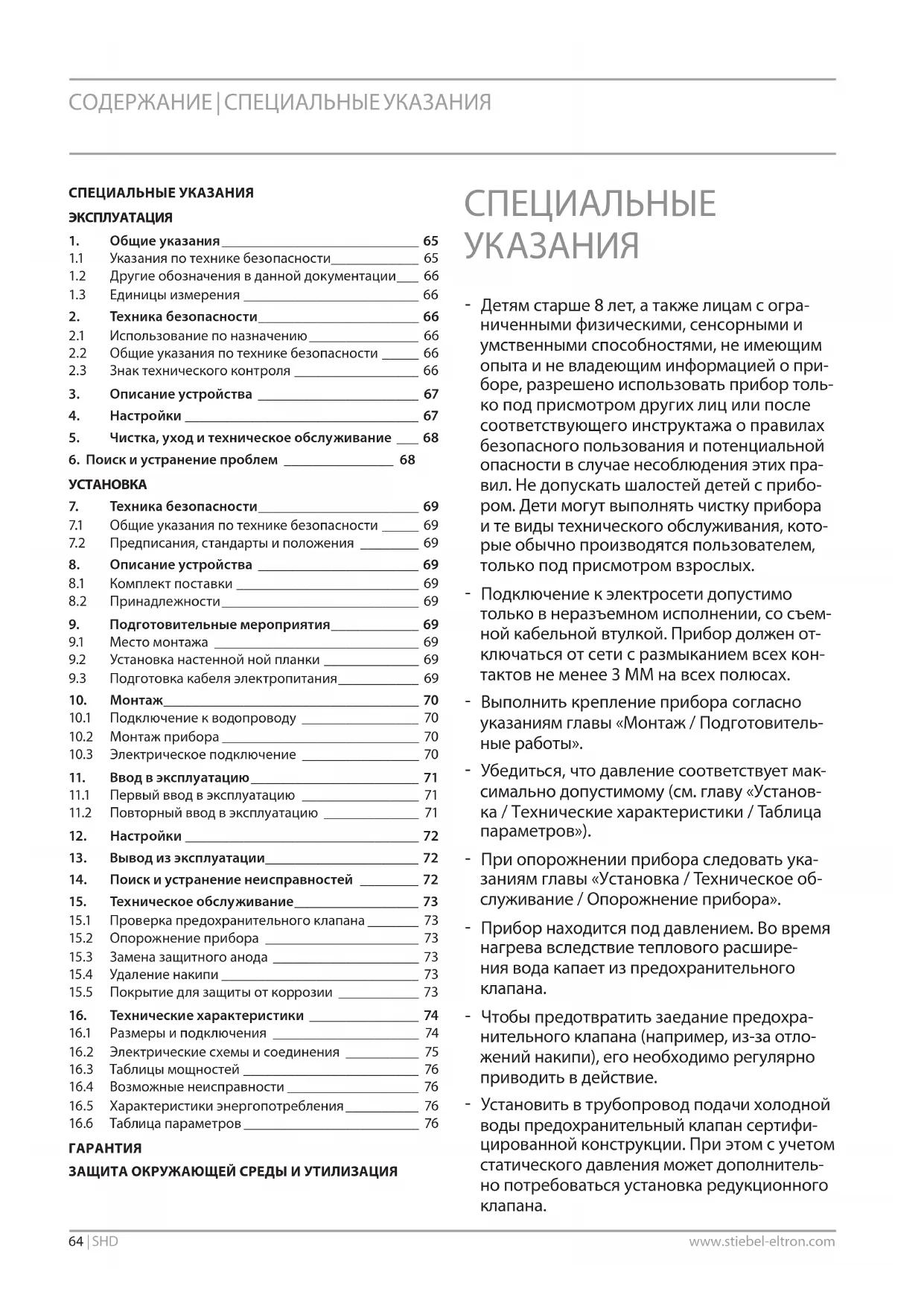 - Чтобы предотвратить заедание предохра- нительного клапана (например, из-за отло- жений накипи), его необходимо регулярно приводить в действие. - Установить в трубопровод подачи холодной воды предохранительный клапан сертифи- цированной конструкции. При этом с учетом статического давления может дополнитель- но потребоваться установка редукционного клапана.ЭКСПЛУАТАЦИЯ Общие указания РУССКИЙwww.stiebel-eltron.com SHD | 65 - Размеры сливной трубки подобрать таким образом, чтобы при полностью открытом предохранительном клапане вода вытекала беспрепятственно. - Продувочную трубку предохранительного клапана монтировать в незамерзающем по- мещении, с постоянным уклоном вниз. - Продувочное отверстие предохранительно- го клапана должно оставаться открытым в