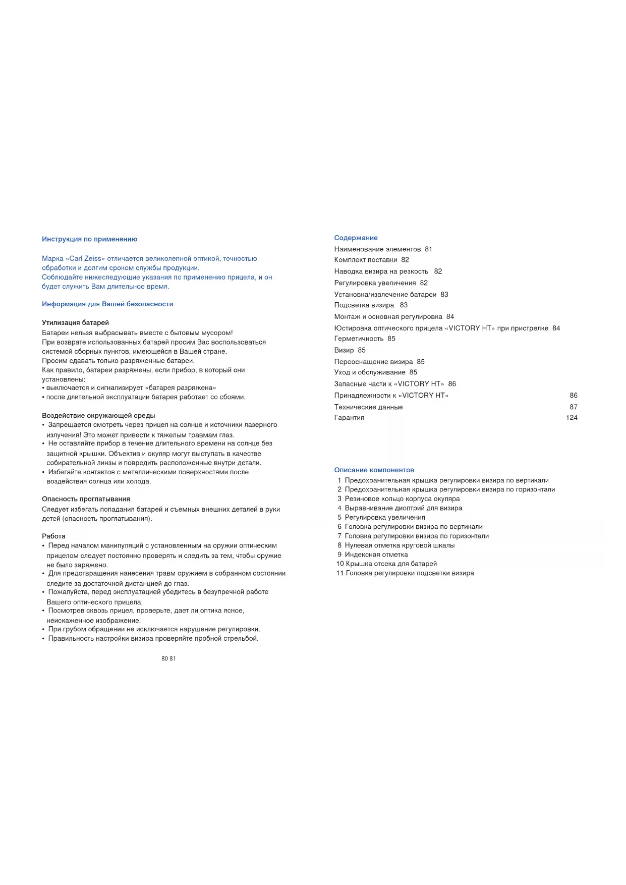 Наименование элементов 81 Комплект поставки 82 Наводка визира на резкость 82 Регулировка увеличения 82 Установка/извлечение батареи 83 Подсветка визира 83 Монтаж и основная регулировка 84 Юстировка оптического прицела «VICTORY HT» при пристрелке 84 Герметичность 85 Визир 85 Переоснащение визира 85 Уход и обслуживание 85 Запасные части к «VICTORY HT» 86 Принадлежности к «VICTORY HT» 86 Технические данные 87 Гарантия 124 Описание компонентов 1 Предохранительная крышка регулировки визира по вертикали 2 Предохранительная крышка регулировки визира по горизонтали 3 Резиновое кольцо корпуса окуляра 4 Выравнивание диоптрий для визира 5 Регулировка увеличения 6 Головка регулировки визира по вертикали 7 Головка регулировки визира по горизонтали 8 Нулевая отметка круговой шкалы 9 Индексная отметка 10 Крышка отсека для батарей 11 Головка регулировки подсветки визира82 83 Комплект поставки Оптические прицелы «VICTORY HT» с подсветкой визира Продукт Номер заказа Комплект поставки VICTORY HT 1,1-4 x 24 M 522404 Оптический прицел Предохранительная