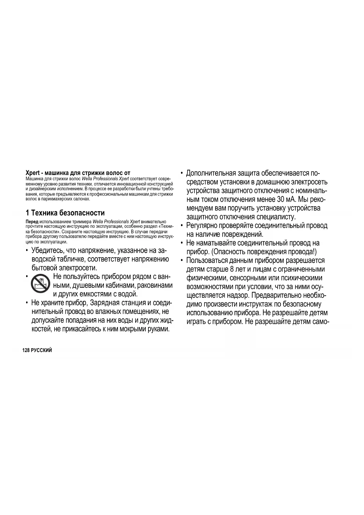 - Пользоваться данным прибором разрешается детям старше 8 лет и лицам с ограниченными физическими, сенсорными или психическими возможностями при условии, что за ними осу- ществляется надзор. Предварительно необхо- димо произвести инструктаж по безопасному использованию прибора. Не разрешайте детям играть с прибором. Не разрешайте детям само- U24_Wella_Xpert.book Seite 128 Mittwoch, 29. Oktober 2014 4:07 04129РУССКИЙ стоятельно производить чистку и техобслужи- вание прибора.