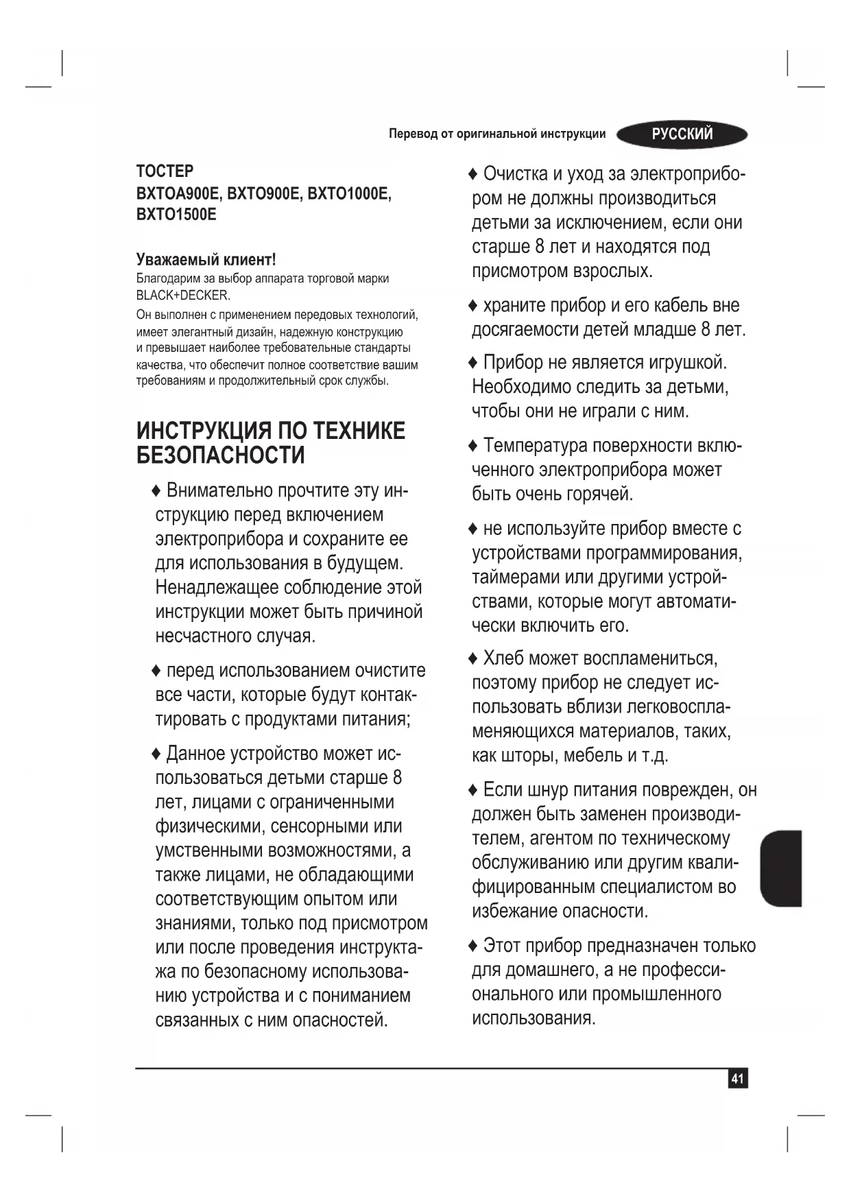 РУКОВОДСТВО ПОЛЬЗОВАТЕЛЯ BXTOA900E BLACK & DECKER