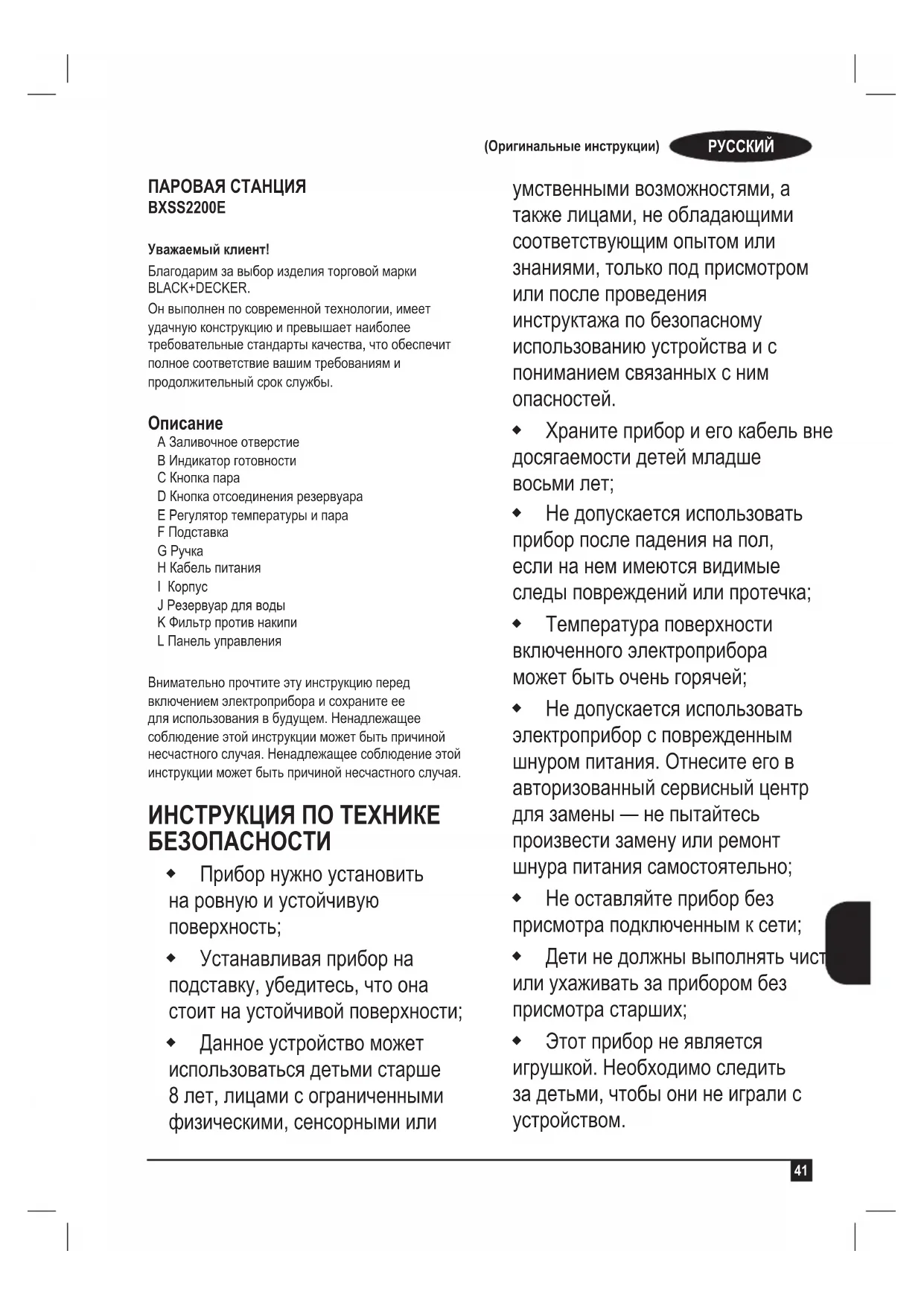 A Заливочное отверстие B Индикатор готовности C Кнопка пара D Кнопка отсоединения резервуара E Регулятор температуры и пара F Подставка G Ручка H Кабель питания I Корпус J Резервуар для воды K Фильтр против накипи L Панель управления Внимательно прочтите эту инструкцию перед включением электроприбора и сохраните ее для использования в будущем. Ненадлежащее соблюдение этой инструкции может быть причиной несчастного случая. Ненадлежащее соблюдение этой инструкции может быть причиной несчастного случая. ИНСТРУКЦИЯ ПО ТЕХНИКЕ БЕЗОПАСНОСТИ Прибор нужно установить на ровную и устойчивую поверхность; Устанавливая прибор на подставку, убедитесь, что она стоит на устойчивой поверхности; Данное устройство может использоваться детьми старше 8 лет, лицами с ограниченными физическими, сенсорными или умственными возможностями, а также лицами, не обладающими соответствующим опытом или знаниями, только под присмотром или после проведения инструктажа по безопасному использованию устройства и с пониманием связанных с ним опасностей. Храните прибор и его кабель вне досягаемости детей младше восьми лет; Не допускается использовать прибор после падения на пол, если на нем имеются видимые следы повреждений или протечка; Температура поверхности включенного электроприбора может быть очень горячей; Не допускается использовать электроприбор с поврежденным шнуром питания. Отнесите его в авторизованный сервисный центр для замены — не пытайтесь произвести замену или ремонт шнура питания самостоятельно; Не оставляйте прибор без присмотра подключенным к сети; Дети не должны выполнять чистку или ухаживать за прибором без присмотра старших; Этот прибор не является игрушкой. Необходимо следить за детьми, чтобы они не играли с устройством.РУССКИЙ (Оригинальные инструкции)