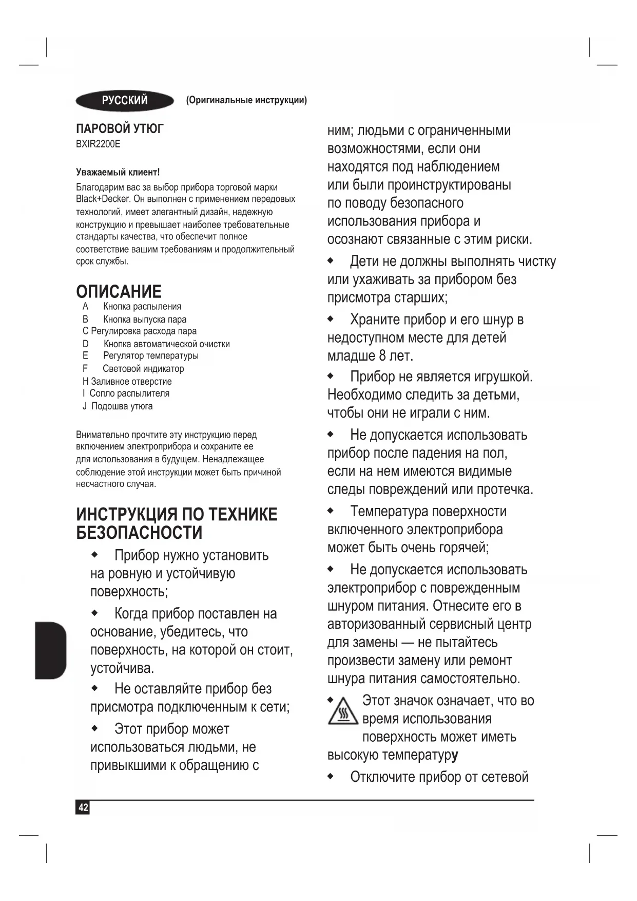 ПАРОВОЙ УТЮГ BXIR2200E Уважаемый клиент! Благодаримвасзавыборприбораторговоймарки Black+Decker.Онвыполненсприменениемпередовых технологий,имеетэлегантныйдизайн,надежную конструкциюипревышаетнаиболеетребовательные стандартыкачества,чтообеспечитполное соответствиевашимтребованиямипродолжительный срокслужбы.