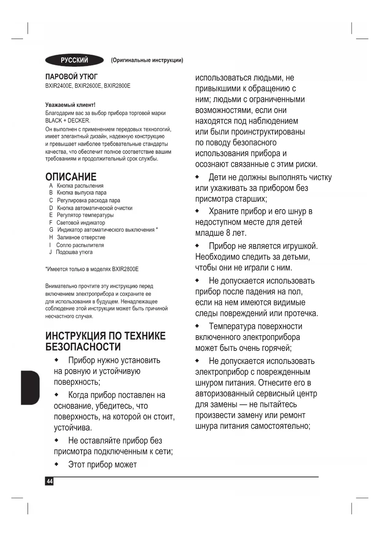 A Кнопка распыления B Кнопка выпуска пара C Регулировка расхода пара D Кнопка автоматической очистки E Регулятор температуры F Световой индикатор G Индикатор автоматического выключения * H Заливное отверстие I Сопло распылителя J Подошва утюга *Имеется только в моделях BXIR2800E Внимательно прочтите эту инструкцию перед включением электроприбора и сохраните ее для использования в будущем. Ненадлежащее соблюдение этой инструкции может быть причиной несчастного случая. ИНСТРУКЦИЯ ПО ТЕХНИКЕ БЕЗОПАСНОСТИ Прибор нужно установить на ровную и устойчивую поверхность; Когда прибор поставлен на основание, убедитесь, что поверхность, на которой он стоит,