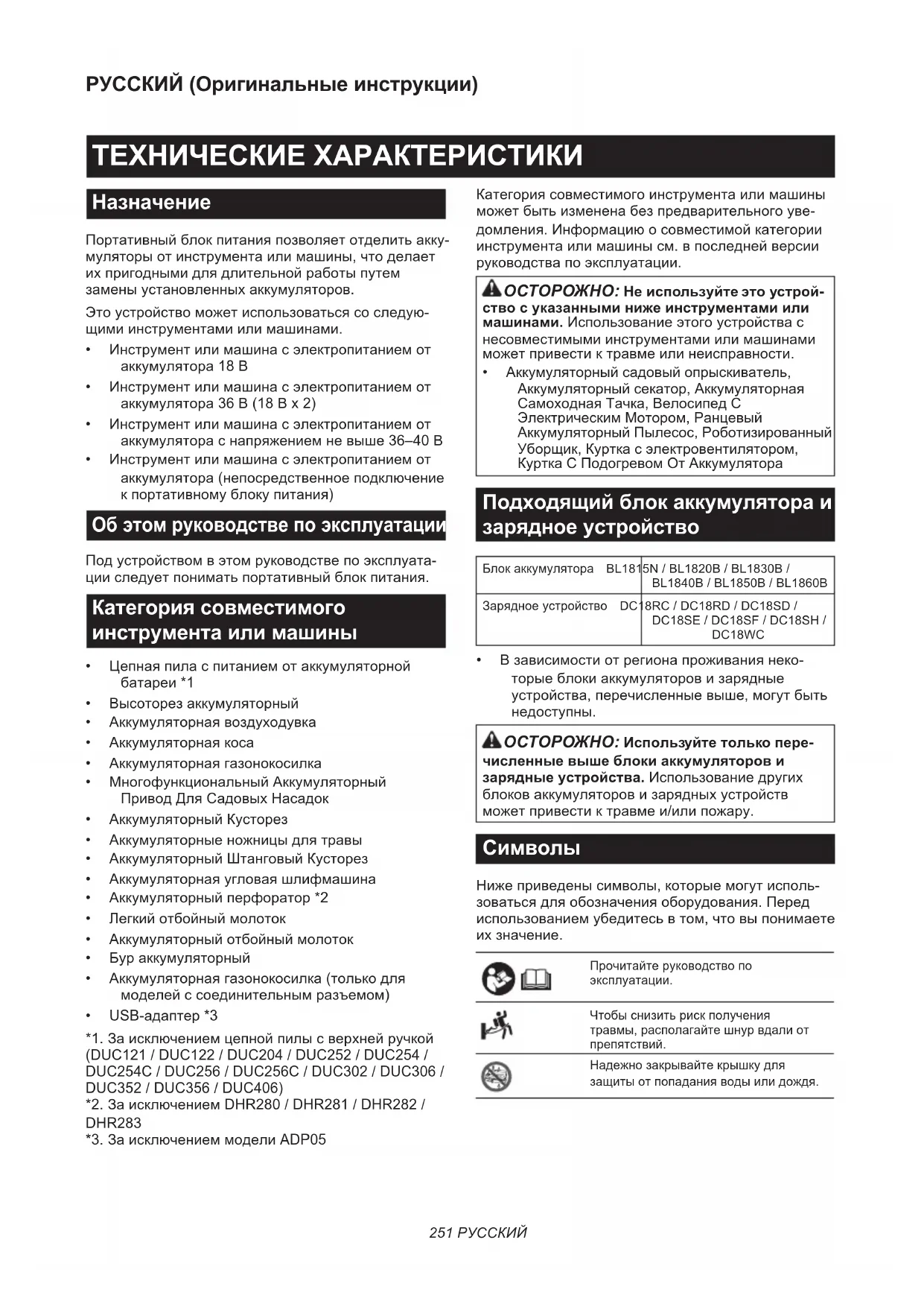 DUC254C/DUC256/DUC256C/DUC302/DUC306/ DUC352/DUC356/DUC406) *2.ЗаисключениемDHR280/DHR281/DHR282/ DHR283 *3.ЗаисключениеммоделиADP05 Категориясовместимогоинструментаилимашины можетбытьизмененабезпредварительногоуве- домления.Информациюосовместимойкатегории инструментаилимашинысм.впоследнейверсии руководствапоэксплуатации. ОСТОРОЖНО: Не используйте это устрой- ство с указанными ниже инструментами или машинами.Использованиеэтогоустройствас несовместимымиинструментамиилимашинами можетпривестиктравмеилинеисправности.