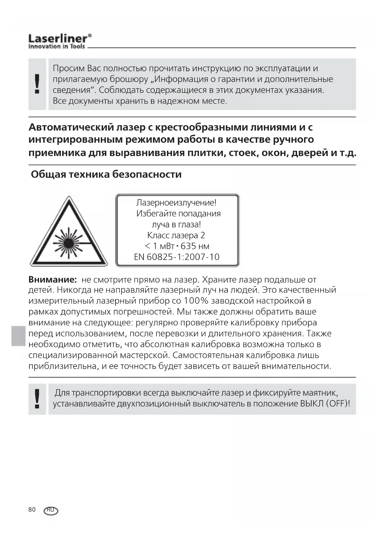 Автоматический лазер с крестообразными линиями и с интегрированным режимом работы в качестве ручного приемника для выравнивания плитки, стоек, окон, дверей и т.д. Общая техника безопасности Внимание: не смотрите прямо на лазер. Храните лазер подальше от детей. Никогда не направляйте лазерный луч на людей. Это качественный измерительный лазерный прибор со 100% заводской настройкой в рамках допустимых погрешностей. Мы также должны обратить ваше внимание на следующее: регулярно проверяйте калибровку прибора перед использованием, после перевозки и длительного хранения. Также необходимо отметить, что абсолютная калибровка возможна только в специализированной мастерской. Самостоятельная калибровка лишь приблизительна, и ее точность будет зависеть от вашей внимательности. Лазерное излучение! Избегайте попадания луча в глаза! Класс лазера 2 < 1 мВт · 635 нм EN 60825-1:2007-10 Для транспортировки всегда выключайте лазер и фиксируйте маятник, устанавливайте двухпозиционный выключатель в положение ВЫКЛ (OFF)!