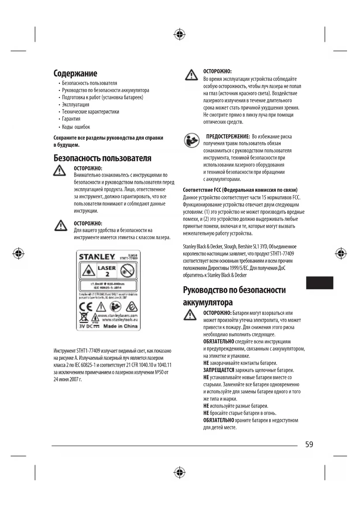 Во время эксплуатации устройства соблюдайте особую осторожность, чтобы луч лазера не попал на глаз (источник красного света). Воздействие лазерного излучения в течение длительного срока может стать причиной ухудшения зрения. Не смотрите прямо в линзу луча при помощи оптических средств. ПРЕДОСТЕРЕЖЕНИЕ: Во избежание риска получения травм пользователь обязан ознакомиться с руководством пользователя инструмента, техникой безопасности при использовании лазерного оборудования и техникой безопасности при обращении с аккумуляторами. Соответствие FCC (Федеральная комиссия по связи) Данное устройство соответствует части 15 нормативов FCC. Функционирование устройства отвечает двум следующим условиям: (1) это устройство не может производить вредные помехи, и (2) это устройство должно выдерживать любые принятые помехи, включая и те, которые могут вызвать нежелательную работу устройства. Stanley Black & Decker, Slough, Bershire SL1 3YD, Объединенное королевство настоящим заявляет, что продукт STHT1-77409 соответствует всем основным требованиям и всем прочим положениям Директивы 1999/5/EC. Для получения ДоС обратитесь к Stanley Black & Decker Руководство по безопасности аккумулятора ОСТОРОЖНО: Батареи могут взорваться или может произойти утечка электролита, что может привести к пожару. Для снижения этого риска необходимо выполнить следующее. ОБЯЗАТЕЛЬНО следуйте всем инструкциям и предупреждениям, связанным с аккумулятором, на этикетке и упаковке. НЕ закорачивайте контакты батареи. ЗАПРЕЩАЕТСЯ заряжать щелочные батареи. НЕ устанавливайте новые батареи вместе со старыми. Заменяйте все батареи одновременно и используйте для замены батареи одного и того же типа и марки. НЕ используйте разные батареи. НЕ бросайте старые батареи в огонь. ОБЯЗАТЕЛЬНО храните батареи в недоступном для детей месте. 59ОБЯЗАТЕЛЬНО извлекайте батареи, если устройство не будет использоваться в течение нескольких месяцев. ПРИМЕЧАНИЕ: Убедитесь, что используются рекомендованные батареи. ПРИМЕЧАНИЕ: Убедитесь в правильности установки батарей с соблюдением полярности. Подготовка к работ (установка
