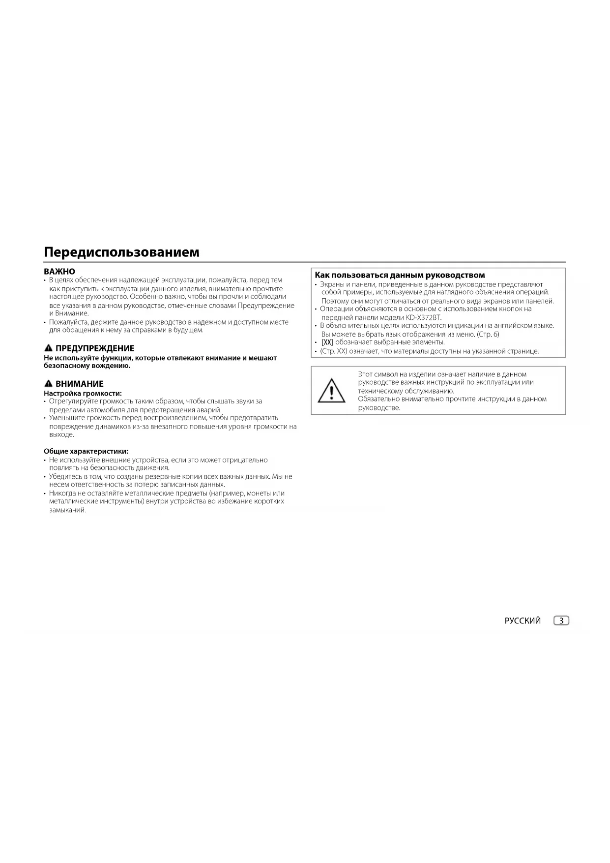 - (Стр.XX) означает, что материалы доступны на указанной странице. Этот символ на изделии означает наличие в данном руководстве важных инструкций по эксплуатации или техническому обслуживанию. Обязательно внимательно прочтите инструкции в данном руководстве. JS_JVC_KD_X372BT_E_RU.indd 3JS_JVC_KD_X372BT_E_RU.indd 3 22/7/2019 9:40:15 AM22/7/2019 9:40:15 AM4