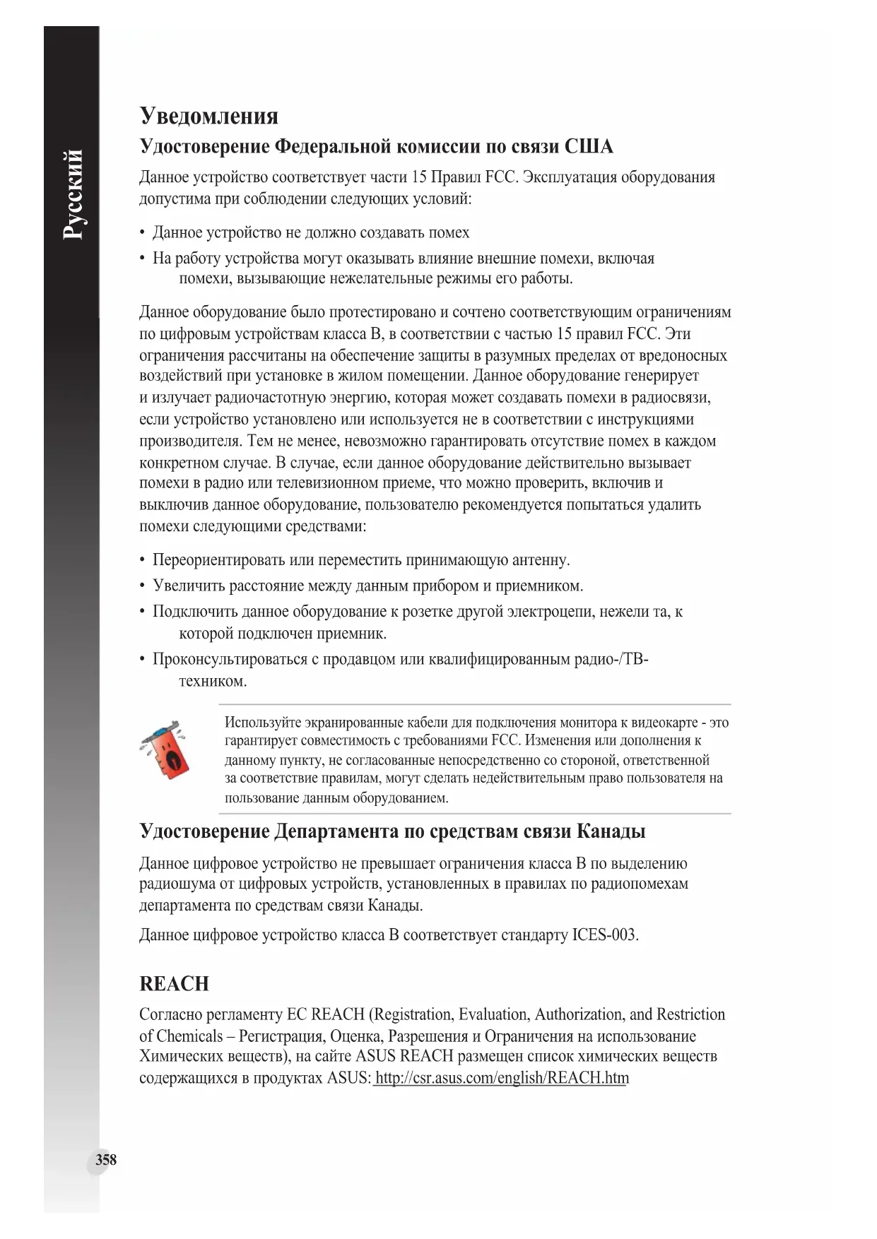 Удостоверение Департамента по средствам связи Канады Данное цифровое устройство не превышает ограничения класса В по выделению радиошума от цифровых устройств, установленных в правилах по радиопомехам департамента по средствам связи Канады. Данное цифровое устройство класса В соответствует стандарту ICES-003. Используйте экранированные кабели для подключения монитора к видеокарте - это гарантирует совместимость с требованиями FCC. Изменения или дополнения к данному пункту, не согласованные непосредственно со стороной, ответственной за соответствие правилам, могут сделать недействительным право пользователя на пользование данным оборудованием. REACH Согласно регламенту ЕС REACH (Registration, Evaluation, Authorization, and Restriction of Chemicals – Регистрация, Оценка, Разрешения и Ограничения на использование Химических веществ), на сайте ASUS REACH размещен список химических веществ содержащихся в продуктах ASUS: http://csr.asus.com/english/REACH.htm359