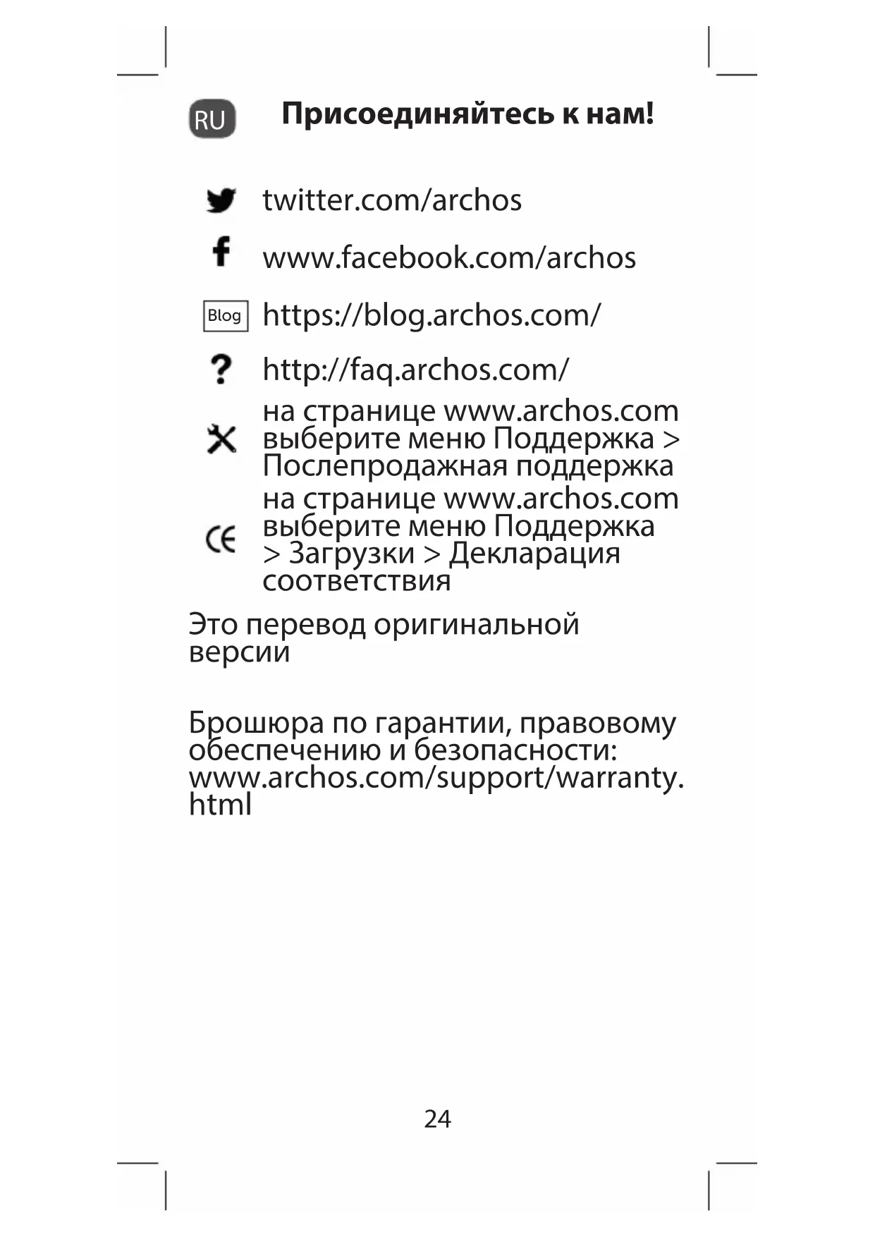Присоединяйтесь к нам! twitter.com/archos www.facebook.com/archos Blog https://blog.archos.com/ http://faq.archos.com/ на странице www.archos.com выберите меню Поддержка > Послепродажная поддержка на странице www.archos.com выберите меню Поддержка > Загрузки > Декларация соответствия Это перевод оригинальной