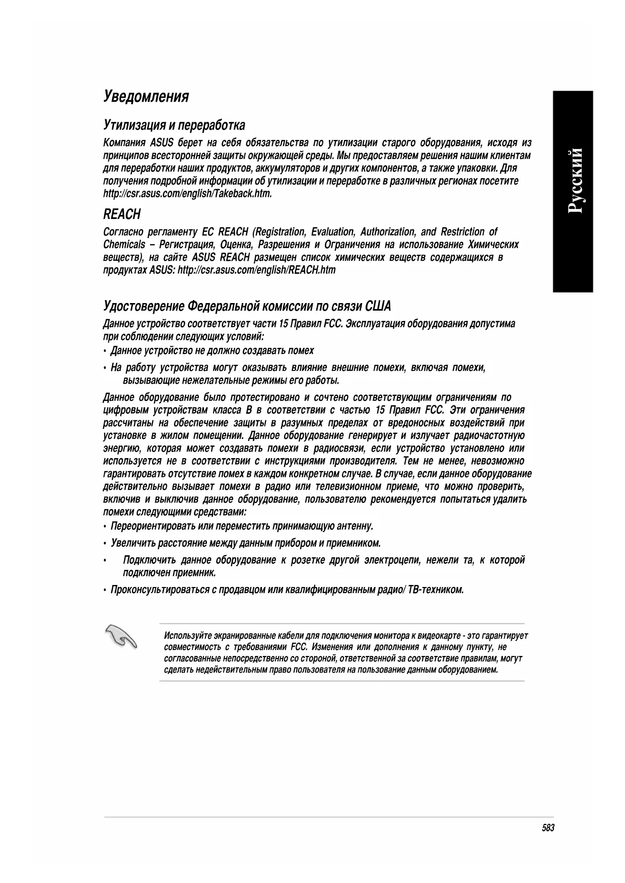 Русский583 Уведомления Утилизация и переработка Компания ASUS берет на себя обязательства по утилизации старого оборудования, исходя из принципов всесторонней защиты окружающей среды. Мы предоставляем решения нашим клиентам для переработки наших продуктов, аккумуляторов и других компонентов, а также упаковки. Для получения подробной информации об утилизации и переработке в различных регионах посетите http://csr.asus.com/english/Takeback.htm. REACH Согласно регламенту ЕС REACH (Registration, Evaluation, Authorization, and Restriction of Chemicals – Регистрация, Оценка, Разрешения и Ограничения на использование Химических веществ), на сайте ASUS REACH размещен список химических веществ содержащихся в продуктах ASUS: http://csr.asus.com/english/REACH.htm Удостоверение Федеральной комиссии по связи США Данное устройство соответствует части 15 Правил FCC. Эксплуатация оборудования допустима при соблюдении следующих условий: