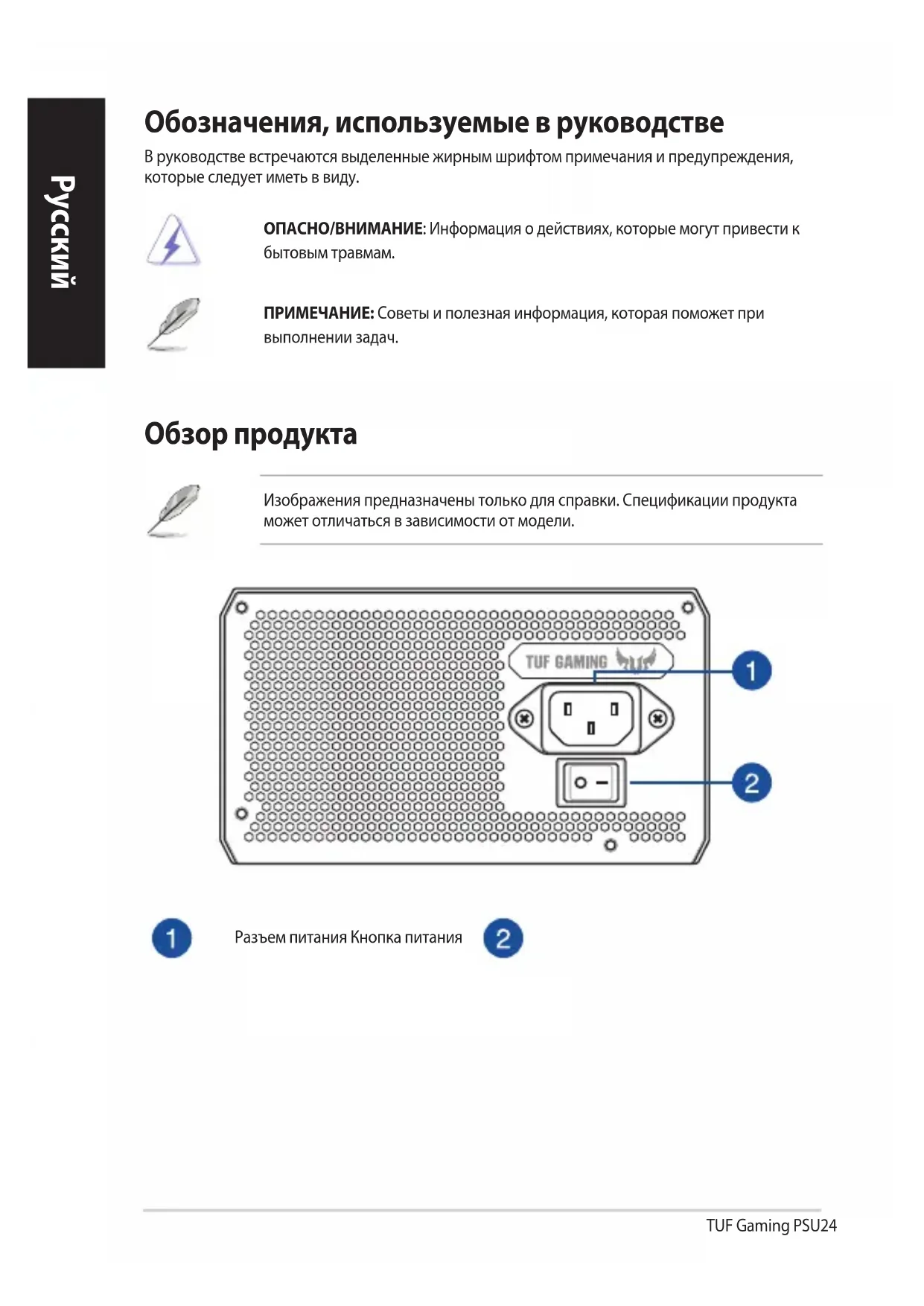 Обозначения, используемые в руководстве В руководстве встречаются выделенные жирным шрифтом примечания и предупреждения, которые следует иметь в виду. ОПАСНО/ВНИМАНИЕ: Информация о действиях, которые могут привести к бытовым травмам. ПРИМЕЧАНИЕ: Советы и полезная информация, которая поможет при выполнении задач. Обзор продукта Разъем питания Кнопка питания Изображения предназначены только для справки. Спецификации продукта может отличаться в зависимости от модели.TUF Gaming PSU 25