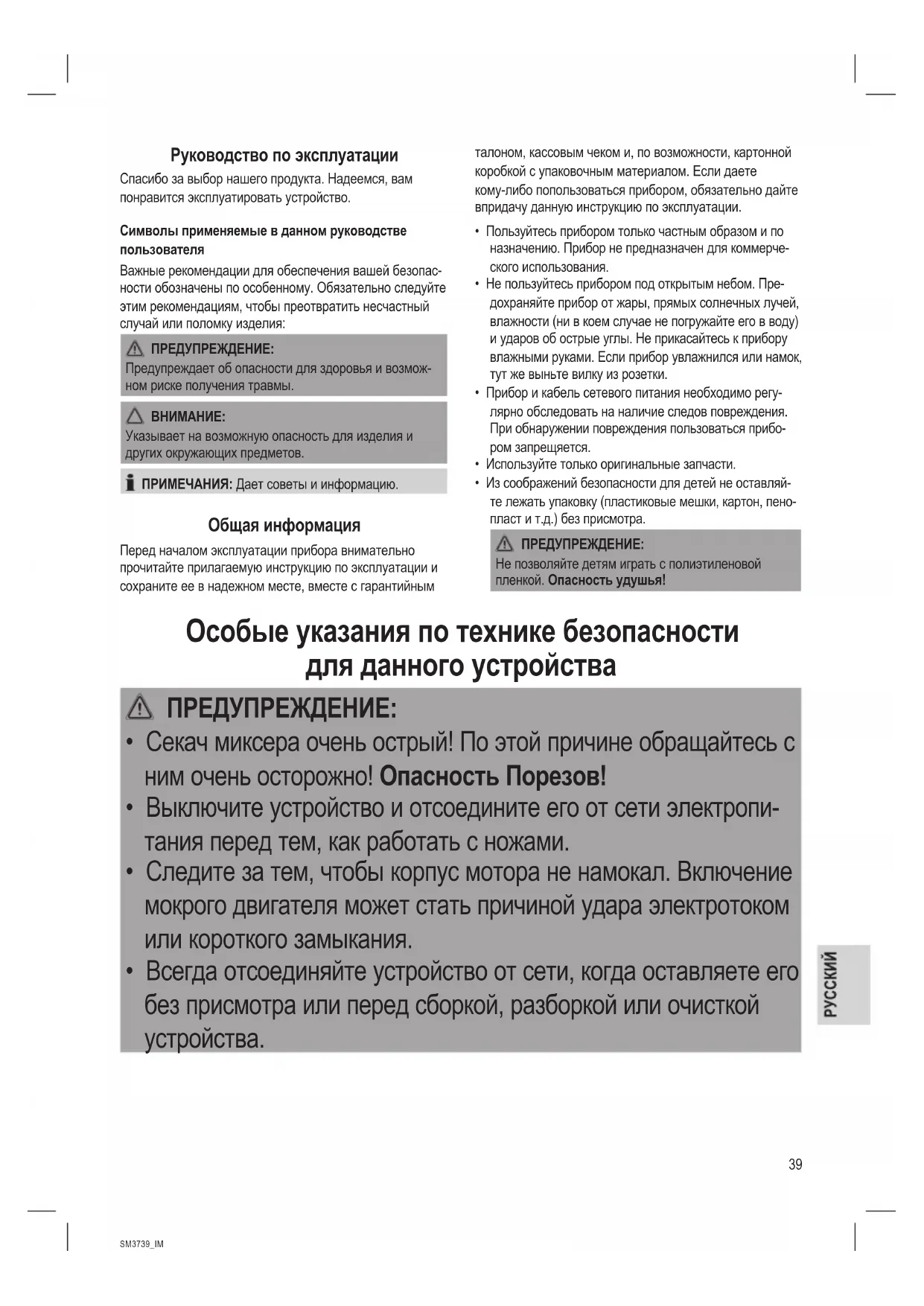 - Всегда отсоединяйте устройство от сети, когда оставляете его без присмотра или перед сборкой, разборкой или очисткой устройства.40 SM3739_IM 14.03.19 ПРЕДУПРЕЖДЕНИЕ: