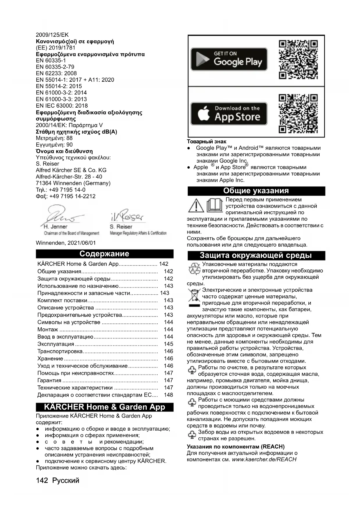 Декларация о соответствии стандартам ЕС Настоящим заявляем, что упомянутое ниже изделие соответствует соответствующим положениям перечисленных директив и регламентов. При любых изменениях изделия, не согласованных с нашей компанией, данная декларация теряет свою силу. Изделие: Моющий аппарат высокого давления Тип: 1.324-xxx Действующие директивы ЕС 2006/42/ЕС (+2009/127/ЕС) 2014/30/EС 2011/65/EС 2000/14/ЕС 2009/125/ЕС Применяемый(-ые) регламент(-ы) (ЕС) 2019/1781 Примененные гармонизированные стандарты EN 60335-1 EN 60335-2-79 EN 62233: 2008 EN 55014-1: 2017 + A11: 2020 EN 55014-2: 2015 EN 61000-3-2: 2014 EN 61000-3-3: 2013 EN IEC 63000: 2018 Примененный метод оценки соответствия 2000/14/ЕС: Приложение V Уровень звуковой мощности дБ(A) Измерено: 88 Гарантировано: 90 Имя и адрес Лицо, ответственное за ведение документации: Ш. Райзер (S. Reiser) Alfred Kärcher SE & Co. KG Alfred-Kärcher-Str. 28 - 40 71364 Winnenden (Germany) Тел.: +49 7195 14-0 Факс: +49 7195 14-2212 Winnenden, 2021/06/01
