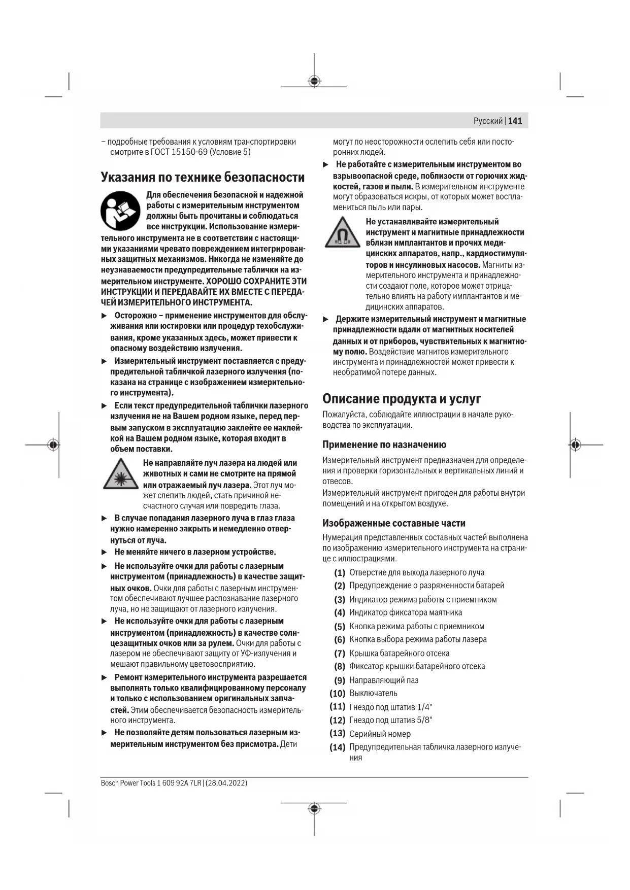 – при разгрузке/погрузке не допускается использова- ние любого вида техники, работающей по принципу зажима упаковки 1 609 92A 7LR | (28.04.2022) Bosch Power ToolsРусский | 141 – подробные требования к условиям транспортировки смотрите в ГОСТ 15150-69 (Условие 5) Указания по технике безопасности Для обеспечения безопасной и надежной работы с измерительным инструментом должны быть прочитаны и соблюдаться все инструкции. Использование измери- тельного инструмента не в соответствии с настоящи- ми указаниями чревато повреждением интегрирован- ных защитных механизмов. Никогда не изменяйте до неузнаваемости предупредительные таблички на из- мерительном инструменте. ХОРОШО СОХРАНИТЕ ЭТИ ИНСТРУКЦИИ И ПЕРЕДАВАЙТЕ ИХ ВМЕСТЕ С ПЕРЕДА- ЧЕЙ ИЗМЕРИТЕЛЬНОГО ИНСТРУМЕНТА. u Осторожно – применение инструментов для обслу- живания или юстировки или процедур техобслужи- вания, кроме указанных здесь, может привести к опасному воздействию излучения. u Измерительный инструмент поставляется с преду- предительной табличкой лазерного излучения (по- казана на странице с изображением измерительно- го инструмента). u Если текст предупредительной таблички лазерного излучения не на Вашем родном языке, перед пер- вым запуском в эксплуатацию заклейте ее наклей- кой на Вашем родном языке, которая входит в объем поставки. Не направляйте луч лазера на людей или животных и сами не смотрите на прямой или отражаемый луч лазера. Этот луч мо- жет слепить людей, стать причиной не- счастного случая или повредить глаза. u В случае попадания лазерного луча в глаз глаза нужно намеренно закрыть и немедленно отвер- нуться от луча. u Не меняйте ничего в лазерном устройстве. u Не используйте очки для работы с лазерным инструментом (принадлежность) в качестве защит- ных очков. Очки для работы с лазерным инструмен- том обеспечивают лучшее распознавание лазерного луча, но не защищают от лазерного излучения. u Не используйте очки для работы с лазерным инструментом (принадлежность) в качестве солн- цезащитных очков или за рулем. Очки для работы с лазером не обеспечивают защиту от УФ-излучения и мешают правильному цветовосприятию. u Ремонт измерительного инструмента разрешается выполнять только квалифицированному персоналу и только с использованием оригинальных запча- стей. Этим обеспечивается безопасность измеритель- ного инструмента. u Не позволяйте детям пользоваться лазерным из- мерительным инструментом без присмотра. Дети могут по неосторожности ослепить себя или посто- ронних людей. u Не работайте с измерительным инструментом во взрывоопасной среде, поблизости от горючих жид- костей, газов и пыли. В измерительном инструменте могут образоваться искры, от которых может воспла- мениться пыль или пары. Не устанавливайте измерительный инструмент и магнитные принадлежности вблизи имплантантов и прочих меди- цинских аппаратов, напр., кардиостимуля- торов и инсулиновых насосов. Магниты из- мерительного инструмента и принадлежно- сти создают поле, которое может отрица- тельно влиять на работу имплантантов и ме- дицинских аппаратов. u Держите измерительный инструмент и магнитные принадлежности вдали от магнитных носителей данных и от приборов, чувствительных к магнитно- му полю. Воздействие магнитов измерительного инструмента и принадлежностей может привести к необратимой потере данных. Описа