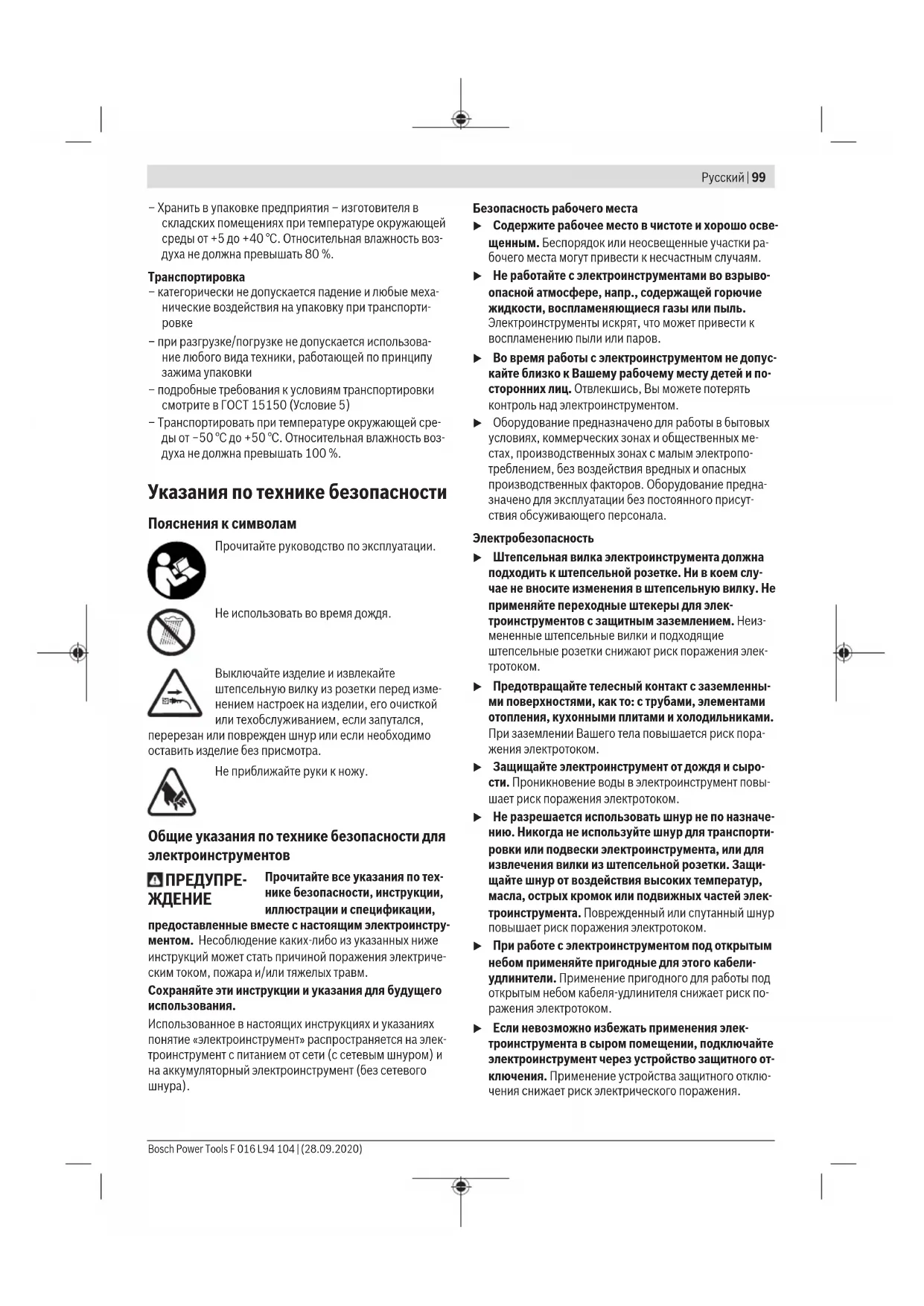 – хранение без упаковки не допускается – подробные требования к условиям хранения смотрите в ГОСТ15150 (Условие1) F 016 L94 104 | (28.09.2020) Bosch Power ToolsРусский | 99 – Хранить в упаковке предприятия– изготовителя в складских помещениях при температуре окружающей среды от +5 до +40°С. Относительная влажность воз- духа не должна превышать 80%. Транспортировка – категорически не допускается падение и любые меха- нические воздействия на упаковку при транспорти-