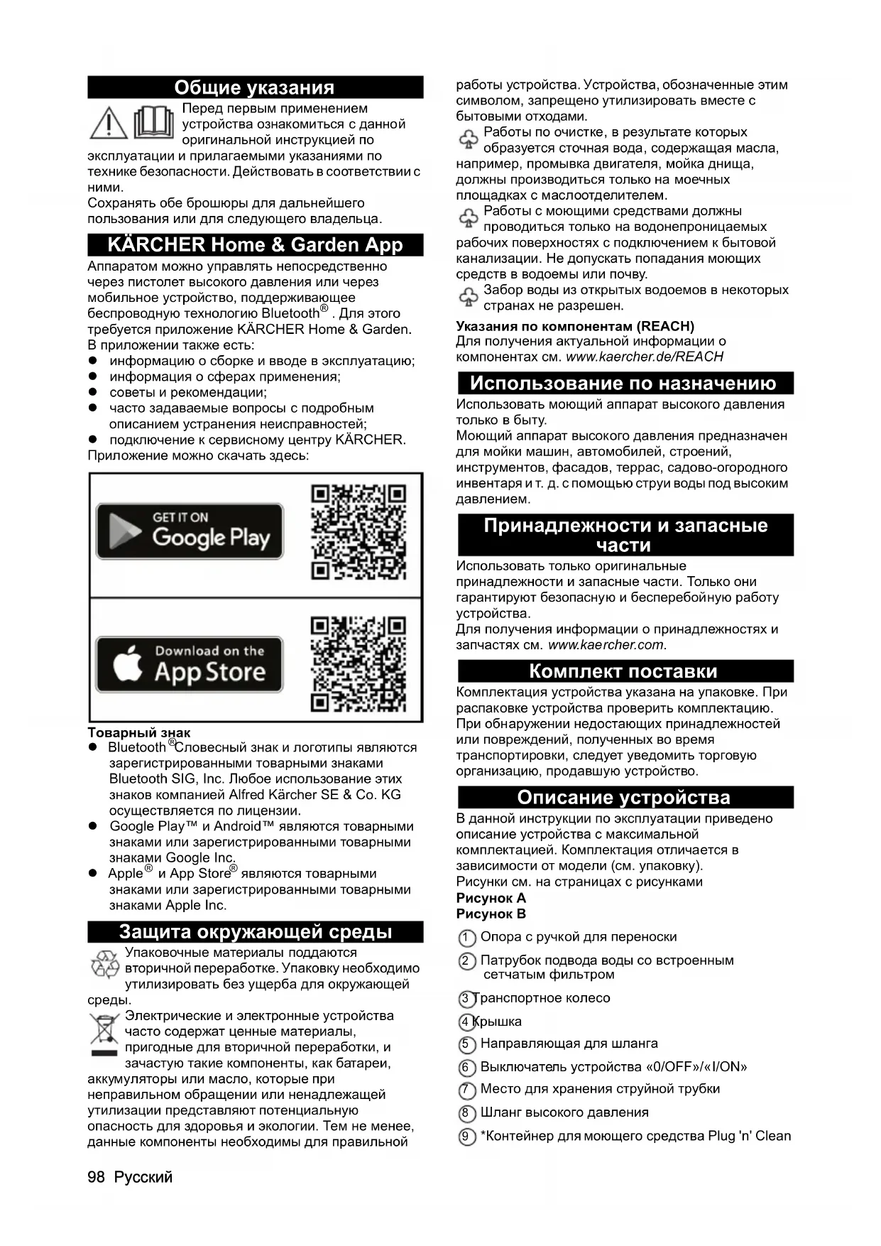 Сохранять обе брошюры для дальнейшего пользования или для следующего владельца. KÄRCHER Home & Garden App Аппаратом можно управлять непосредственно через пистолет высокого давления или через мобильное устройство, поддерживающее беспроводную технологию Bluetooth