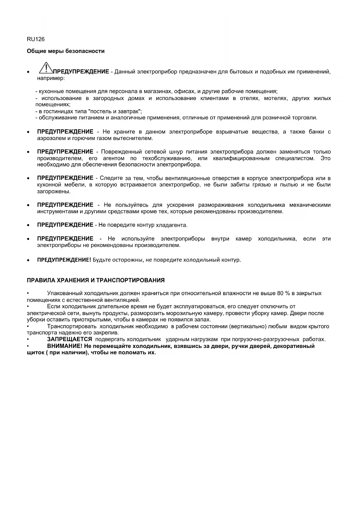 - ВНИМАНИЕ! Не перемещайте холодильник, взявшись за двери, ручки дверей, декоративный щиток ( при наличии), чтобы не поломать их.RU127