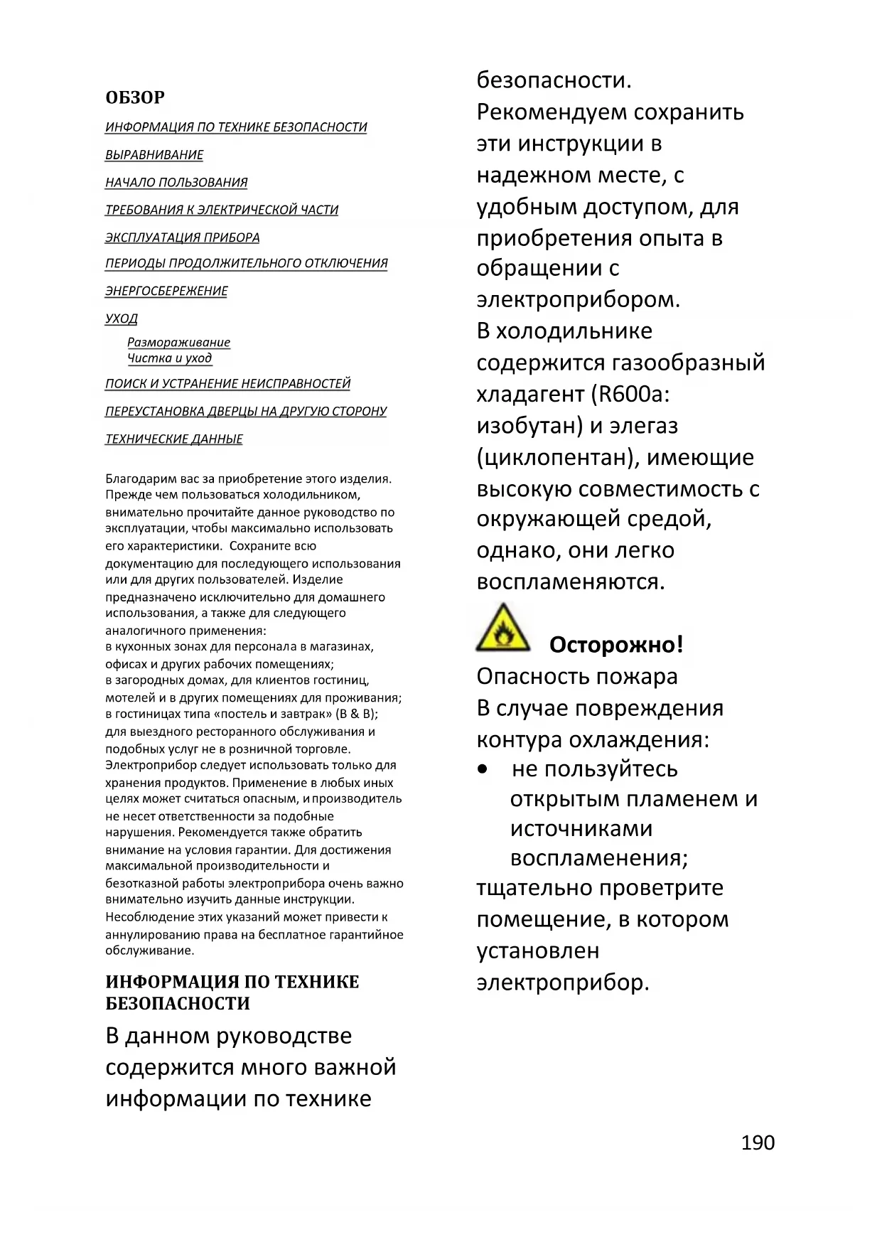 ИНФОРМАЦИЯ ПО ТЕХНИКЕ БЕЗОПАСНОСТИ ВЫРАВНИВАНИЕ НАЧАЛО ПОЛЬЗОВАНИЯ ТРЕБОВАНИЯ К ЭЛЕКТРИЧЕСКОЙ ЧАСТИ ЭКСПЛУАТАЦИЯ ПРИБОРА ПЕРИОДЫ ПРОДОЛЖИТЕЛЬНОГО ОТКЛЮЧЕНИЯ ЭНЕРГОСБЕРЕЖЕНИЕ УХОД Размораживание Чистка и уход ПОИСК И УСТРАНЕНИЕ НЕИСПРАВНОСТЕЙ ПЕРЕУСТАНОВКА ДВЕРЦЫ НА ДРУГУЮ СТОРОНУ ТЕХНИЧЕСКИЕ ДАННЫЕ Благодарим вас за приобретение этого изделия. Прежде чем пользоваться холодильником, внимательно прочитайте данное руководство по эксплуатации, чтобы максимально использовать его характеристики. Сохраните всю документацию для последующего использования или для других пользователей. Изделие предназначено исключительно для домашнего использования, а также для следующего аналогичного применения: в кухонных зонах для персонала в магазинах, офисах и других рабочих помещениях; в загородных домах, для клиентов гостиниц, мотелей и в других помещениях для проживания; в гостиницах типа «постель и завтрак» (B & B); для выездного ресторанного обслуживания и подобных услуг не в розничной торговле. Электроприбор следует использовать только для хранения продуктов. Применение в любых иных целях может считаться опасным, и производитель не несет ответственности за подобные нарушения. Рекомендуется также обратить внимание на условия гарантии. Для достижения максимальной производительности и безотказной работы электроприбора очень важно внимательно изучить данные инструкции. Несоблюдение этих указаний может привести к аннулированию права на бесплатное гарантийное обслуживание. ИНФОРМАЦИЯ ПО ТЕХНИКЕ БЕЗОПАСНОСТИ В данном руководстве содержится много важной информации по технике безопасности. Рекомендуем сохранить эти инструкции в надежном месте, с удобным доступом, для приобретения опыта в обращении с электроприбором. В холодильнике содержится газообразный хладагент (R600a: изобутан) и элегаз (циклопентан), имеющие высокую совместимость с окружающей средой, однако, они легко воспламеняются.