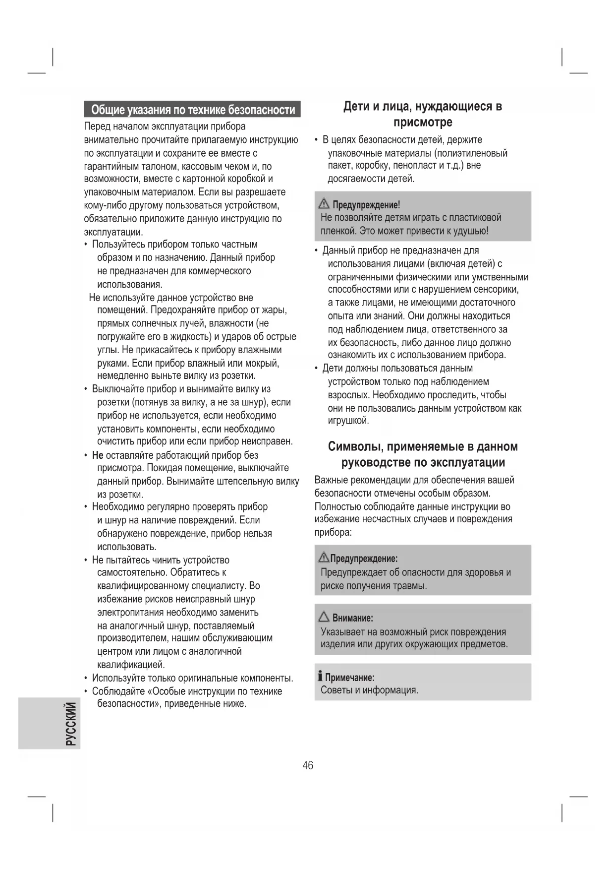 Указывает на возможный риск повреждения изделия или других окружающих предметов. Примечание: Советы и информация.47