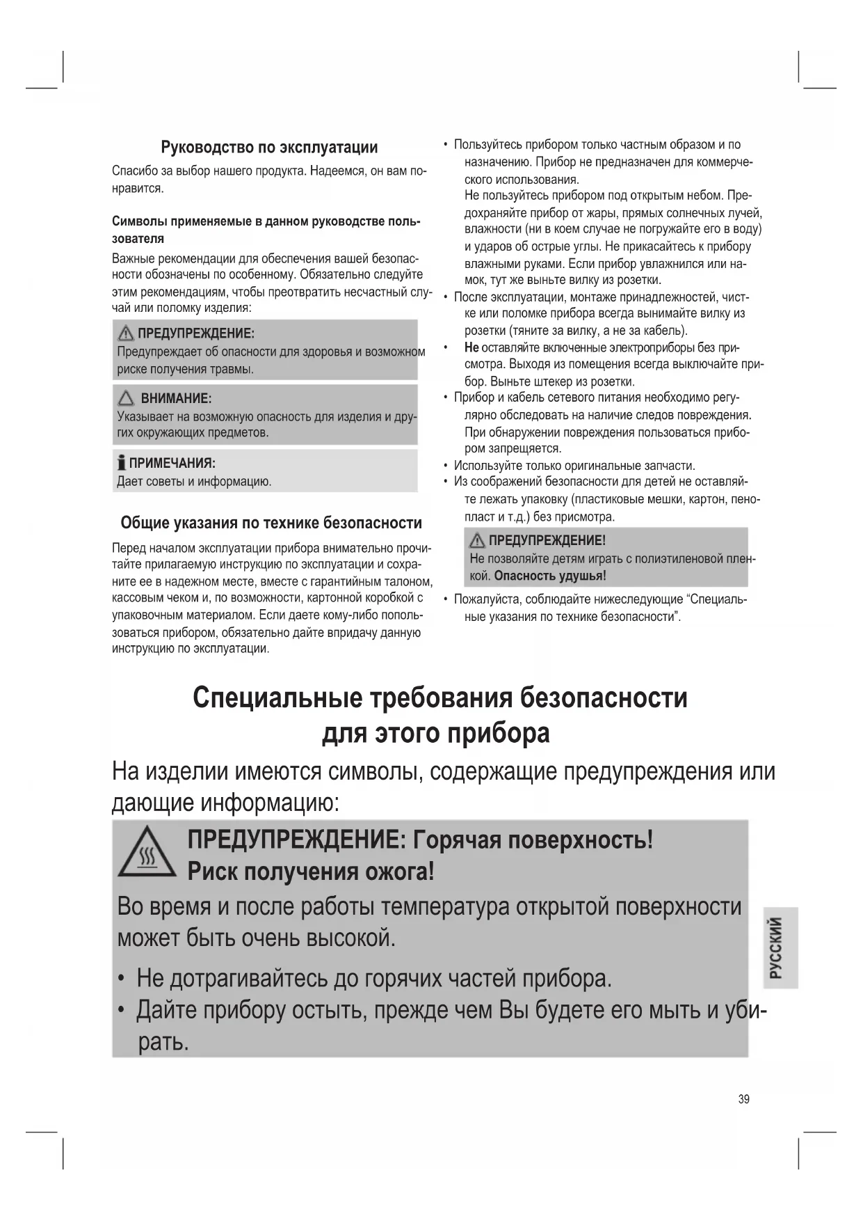 - Пожалуйста, соблюдайте нижеследующие “Специаль- ные указания по технике безопасности”. Специальные требования безопасности для этого прибора На изделии имеются символы, содержащие предупреждения или дающие информацию: ПРЕДУПРЕЖДЕНИЕ: Горячая поверхность! Риск получения ожога! Во время и после работы температура открытой поверхности может быть очень высокой.