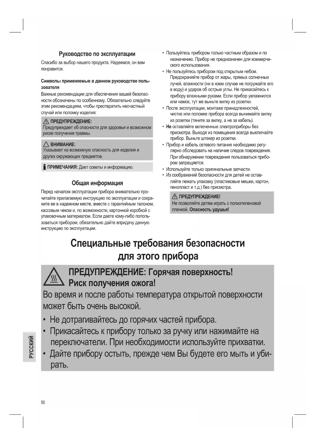 - Из соображений безопасности для детей не остав- ляйте лежать упаковку (пластиковые мешки, картон, пенопласт и т.д.) без присмотра. ПРЕДУПРЕЖДЕНИЕ! Не позволяйте детям играть с полиэтиленовой пленкой. Опасность удушья! Специальные требования безопасности для этого прибора ПРЕДУПРЕЖДЕНИЕ: Горячая поверхность! Риск получения ожога! Во время и после работы температура открытой поверхности может быть очень высокой.
