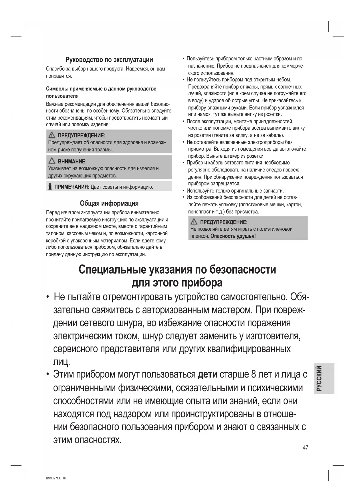 - Этим прибором могут пользоваться дети старше 8 лет и лица с ограниченными физическими, осязательными и психическими способностями или не имеющие опыта или знаний, если они находятся под надзором или проинструктированы в отноше- нии безопасного пользования прибором и знают о связанных с этим опасностях.48 BS9027CB_IM 08.03.16