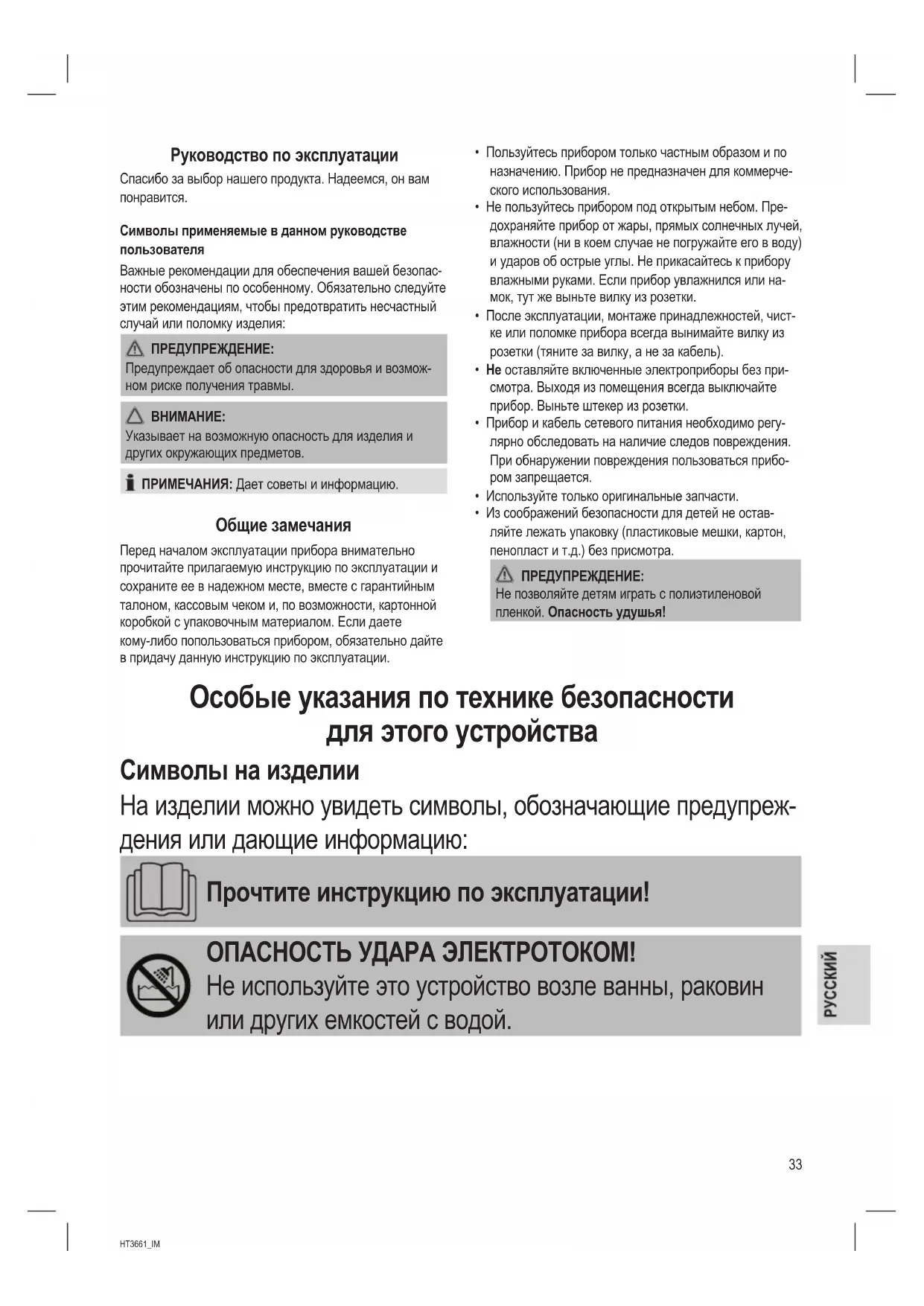 - Из соображений безопасности для детей не остав- ляйте лежать упаковку (пластиковые мешки, картон, пенопласт и т.д.) без присмотра. ПРЕДУПРЕЖДЕНИЕ: Не позволяйте детям играть с полиэтиленовой пленкой. Опасность удушья! Особые указания по технике безопасности для этого устройства Символы на изделии На изделии можно увидеть символы, обозначающие предупреж- дения или дающие информацию: Прочтите инструкцию по эксплуатации! ОПАСНОСТЬ УДАРА ЭЛЕКТРОТОКОМ! Не используйте это устройство возле ванны, раковин или других емкостей с водой.34 HT3661_IM 07.07.16 ПРЕДУПРЕЖДЕНИЕ: