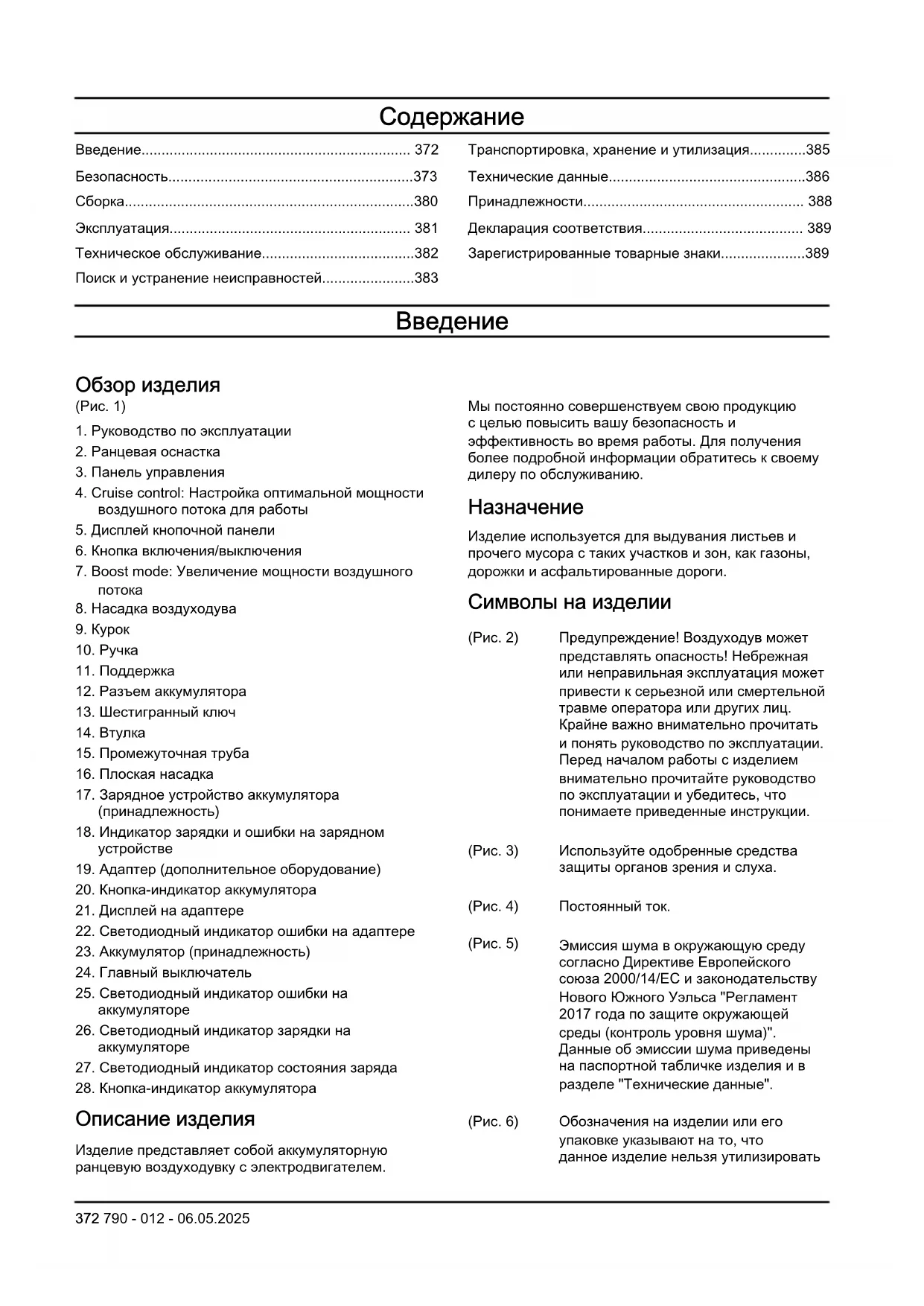 Изделие используется для выдувания листьев и прочего мусора с таких участков и зон, как газоны, дорожки и асфальтированные дороги. Символы на изделии (Pис. 2) Предупреждение! Воздуходув может представлять опасность! Небрежная или неправильная эксплуатация может привести к серьезной или смертельной травме оператора или других лиц. Крайне важно внимательно прочитать и понять руководство по эксплуатации. Перед началом работы с изделием внимательно прочитайте руководство по эксплуатации и убедитесь, что понимаете приведенные инструкции. (Pис. 3) Используйте одобренные средства защиты органов зрения и слуха. (Pис. 4) Постоянный ток. (Pис. 5) Эмиссия шума в окружающую среду согласно Директиве Европейского союза 2000/14/EC и законодательству Нового Южного Уэльса "Регламент 2017 года по защите окружающей среды (контроль уровня шума)". Данные об эмиссии шума приведены на паспортной табличке изделия и в разделе "Технические данные". (Pис. 6) Обозначения на изделии или его упаковке указывают на то, что данное изделие нельзя утилизировать 372 790 - 012 - 06.05.2025вместе с бытовыми отходами. Изделие подлежит утилизации на соответствующем предприятии по переработке отходов. (Pис. 7) Изделие соответствует действующим директивам EC. (Pис. 8) Предусмотрена защита от брызг воды. (Pис. 9) Предупреждающий светодиодный