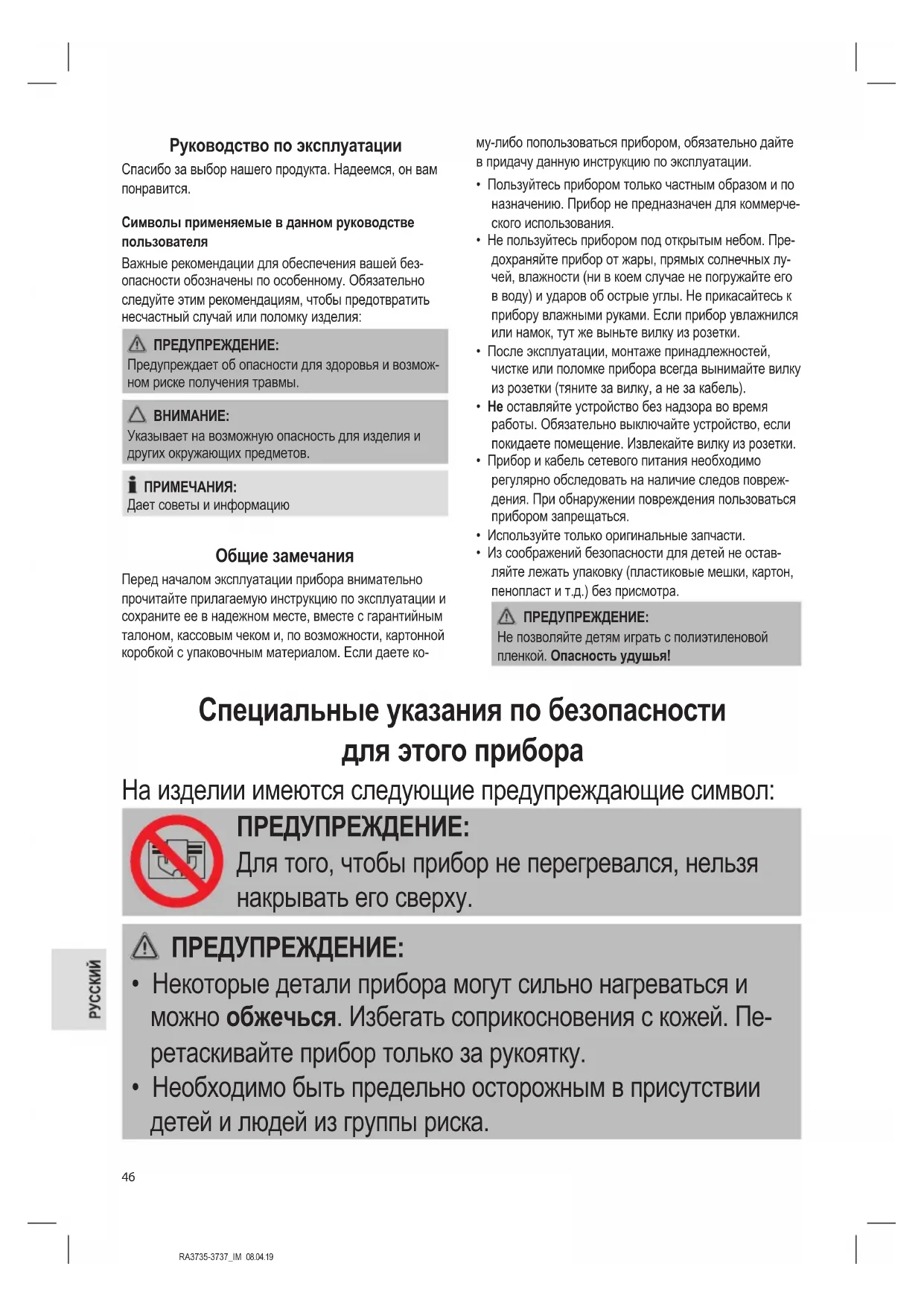 - Не отремонтируйте устройство самостоятельно. Обяза- тельно свяжитесь с авторизованным мастером. При повреж- дении сетевого шнура, во избежание опасности поражения электрическим током, шнур следует заменить у изготовителя, сервисного представителя или других квалифицированных лиц.RA3735-3737_IM 08.04.19