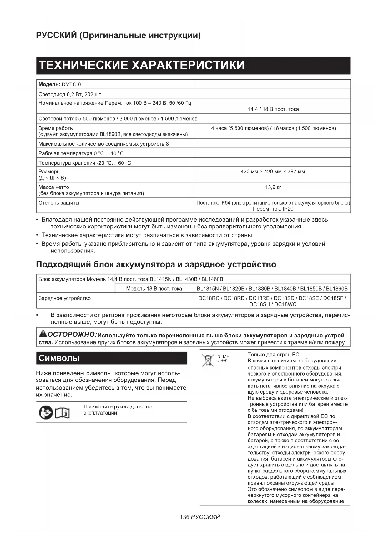 - Makita algupärane aku ja laadija MÄRKUS: Mõned nimekirjas loetletud tarvikud või- vad kuuluda standardvarustusse ning need on lisatud tööriista pakendisse. Need võivad riigiti erineda.136 РУССКИЙ РУССКИЙ (Оригинальные инструкции) ТЕХНИЧЕСКИЕ ХАРАКТЕРИСТИКИ Модель: DML810 Светодиод 0,2 Вт, 202 шт. Номинальное напряжение Перем. ток 100 В – 240 В, 50 /60 Гц 14,4 / 18 В пост. тока Световой поток 5 500 люменов / 3 000 люменов / 1 500 люменов Время работы (с двумя аккумуляторами BL1860B, все светодиоды включены) 4 часа (5 500 люменов) / 18 часов (1 500 люменов) Максимальное количество соединяемых устройств 8 Рабочая температура 0 °C… 40 °C Температура хранения -20 °C… 60 °C