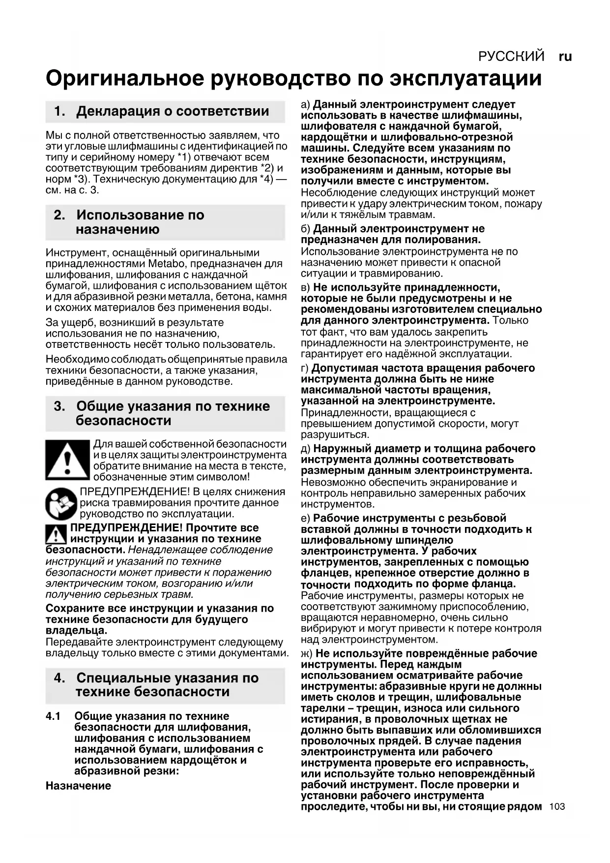 Оригинальное руководство по эксплуатации Мы с полной ответственностью заявляем, что эти угловые шлифмашины с идентификацией по типу и серийному номеру *1) отвечают всем соответствующим требованиям директив *2) и норм *3). Техническую документацию для *4) — см. на с. 3. Инструмент, оснащённый оригинальными принадлежностями Metabo, предназначен для шлифования, шлифования с наждачной бумагой, шлифования с использованием щёток и для абразивной резки металла, бетона, камня и схожих материалов без применения воды. За ущерб, возникший в результате использования не по назначению, ответственность несёт только пользователь. Необходимо соблюдать общепринятые правила техники безопасности, а также указания, приведённые в данном руководстве. Для вашей собственной безопасности и в целях защиты электроинструмента обратите внимание на места в тексте, обозначенные этим символом! ПРЕДУПРЕЖДЕНИЕ! В целях снижения риска травмирования прочтите данное руководство по эксплуатации. ПРЕДУПРЕЖДЕНИЕ! Прочтите все инструкции и указания по технике безопасности. Ненадлежащее соблюдение инструкций и указаний по технике безопасности может привести к поражению электрическим током, возгоранию и/или получению серьезных травм. Сохраните все инструкции и указания по технике безопасности для будущего