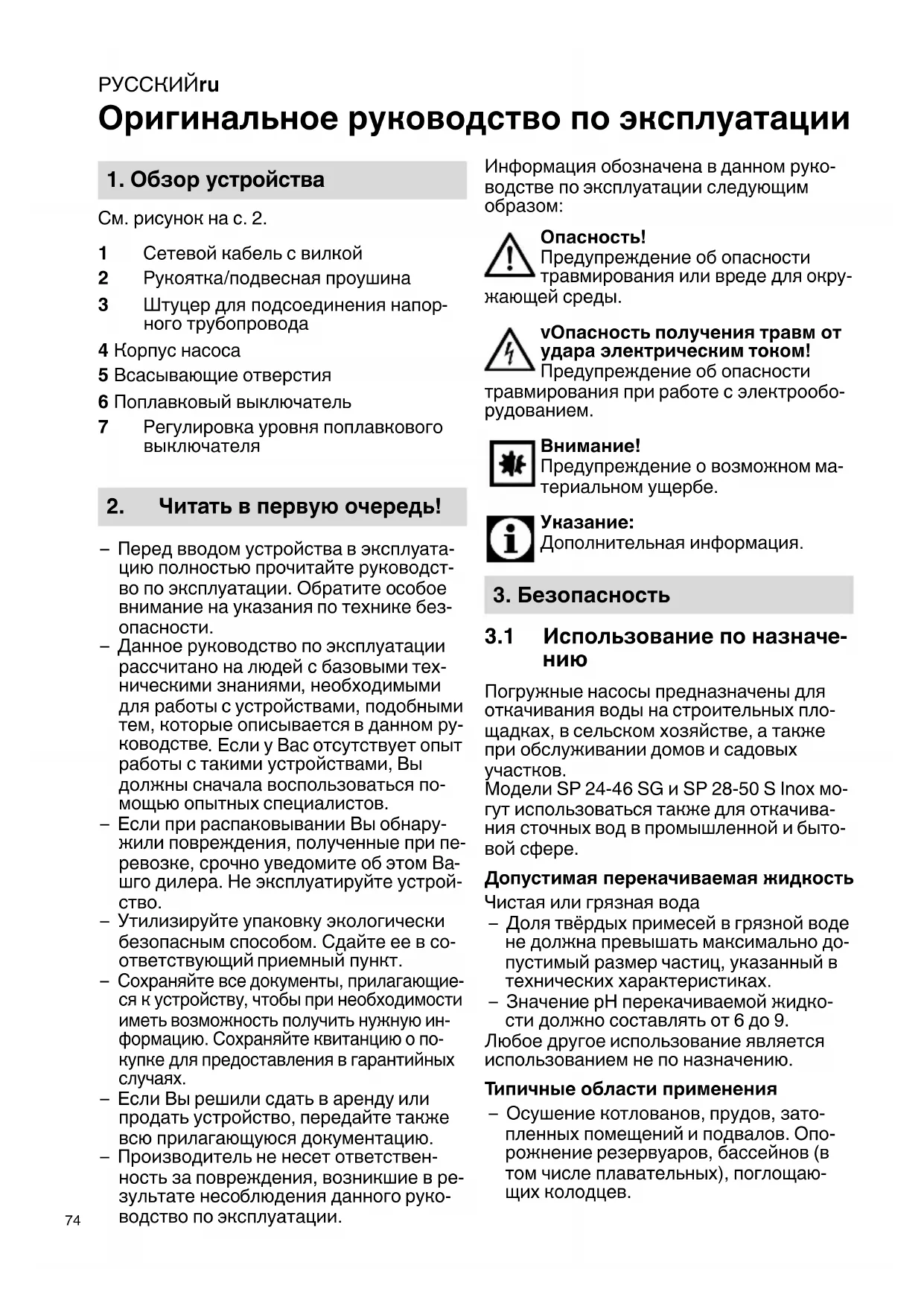 – При использовании насоса в плавательных бассейнах и са- довых прудах, а также их ох- ранных зонах соблюдайте предписания, изложенные в директиве IEC 60364-7-702. Кроме этого, соблюдайте предписания, действующие в вашей стране. – Защита устройства должна осуществляться с помощью автомата защиты от тока утечки (RCD) с установлен- ным током утечки макс. 30 мА. Общие опасности! Не эксплуатируйте насос, если имеется контакт людей с перекачиваемой жидкостью (например, в плавательных бас- сейнах и садовых прудах)! При эксплуатации погружных насосов существуют следующие остаточные опасности, которыеРУССКИЙru