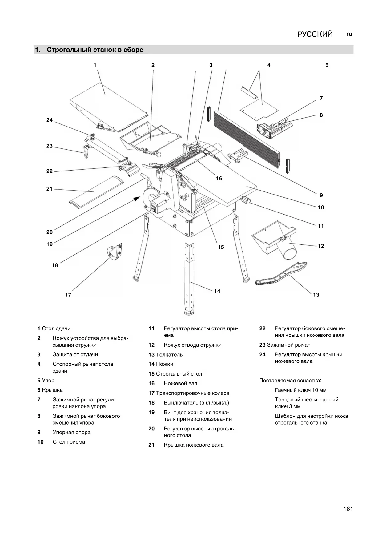 21 Крышка ножевого вала 22 Регулятор бокового смеще- ния крышки ножевого вала 23 Зажимной рычаг 24 Регулятор высоты крышки ножевого вала Поставляемая оснастка: Гаечный ключ 10 мм Торцовый шестигранный ключ 3 мм Шаблон для настройки ножа строгального станка HC260_XW0014D5_ru.fm Оригинальное руководство по эксплуатации162