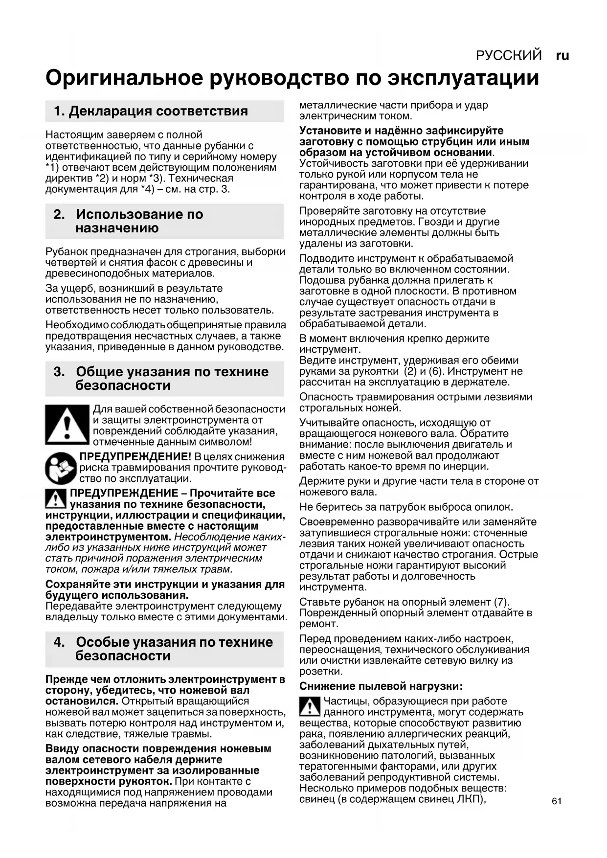 Оригинальное руководство по эксплуатации Настоящим заверяем с полной ответственностью, что данные рубанки с идентификацией по типу и серийному номеру *1) отвечают всем действующим положениям директив *2) и норм *3). Техническая документация для *4) – см. на стр. 3. Рубанок предназначен для строгания, выборки четвертей и снятия фасок с древесины и древесиноподобных материалов. За ущерб, возникший в результате использования не по назначению, ответственность несет только пользователь. Необходимо соблюдать общепринятые правила предотвращения несчастных случаев, а также указания, приведенные в данном руководстве. Для вашей собственной безопасности и защиты электроинструмента от повреждений соблюдайте указания, отмеченные данным символом! ПРЕДУПРЕЖДЕНИЕ! В целях снижения риска травмирования прочтите руковод- ство по эксплуатации. ПРЕДУПРЕЖДЕНИЕ – Прочитайте все указания по технике безопасности, инструкции, иллюстрации и спецификации, предоставленные вместе с настоящим электроинструментом. Несоблюдение каких- либо из указанных ниже инструкций может стать причиной поражения электрическим током, пожара и/или тяжелых травм. Сохраняйте эти инструкции и указания для будущего использования. Передавайте электроинструмент следующему владельцу только вместе с этими документами. Прежде чем отложить электроинструмент в сторону, убедитесь, что ножевой вал остановился. Открытый вращающийся ножевой вал может зацепиться за поверхность, вызвать потерю контроля над инструментом и, как следствие, тяжелые травмы. Ввиду опасности повреждения ножевым валом сетевого кабеля держите электроинструмент за изолированные поверхности рукояток. При контакте с находящимися под напряжением проводами возможна передача напряжения на металлические части прибора и удар электрическим током. Установите и надёжно зафиксируйте заготовку с помощью струбцин или иным образом на устойчивом основании. Устойчивость заготовки при её удерживании только рукой или корпусом тела не гарантирована, что может привести к потере контроля в ходе работы. Проверяйте заготовку на отсутствие инородных предметов. Гвозди и другие металлические элементы должны быть удалены из заготовки. Подводите инструмент к обрабатываемой детали только во включенном состоянии. Подошва рубанка должна прилегать к заготовке в одной плоскости. В противном случае существует опасность отдачи в результате застревания инструмента в обрабатываемой детали. В момент включения крепко держите инструмент. Ведите инструмент, удерживая его обеими руками за рукоятки (2) и (6). Инструмент не рассчитан на эксплуатацию в держателе. Опасность травмирования острыми лезвиями строгальных ножей. Учитывайте опасность, исходящую от вращающегося ножевого вала. Обратите внимание: после выключения двигатель и вместе с ним ножевой вал продолжают работать какое-то время по инерции. Держите руки и другие части тела в стороне от ножевого вала. Не беритесь за патрубок выброса опилок. Своевременно разворачивайте или заменяйте затупившиеся строгальные ножи: сточенные лезвия таких ножей увеличивают опасность отдачи и снижают качество строгания. Острые строгальные ножи гарантируют высокий результат работы и долговечность инструмента. Ставьте рубанок на опорный элемент (7). Поврежденный опорный элемент отдав