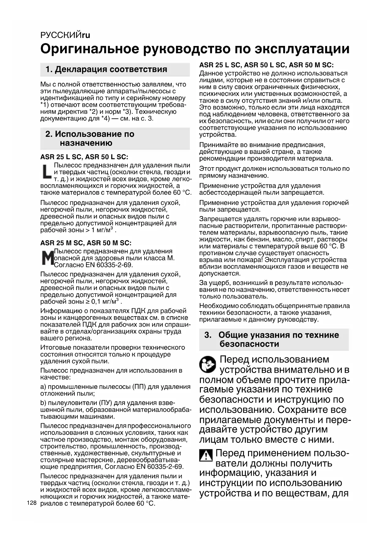 Оригинальное руководство по эксплуатации Мы с полной ответственностью заявляем, что эти пылеудаляющие аппараты/пылесосы с идентификацией по типу и серийному номеру *1) отвечают всем соответствующим требова- ниям директив *2) и норм *3). Техническую документацию для *4) — см. на с. 3. ASR 25 L SC, ASR 50 L SC: Пылесос предназначен для удаления пыли и твердых частиц (осколки стекла, гвозди и т. д.) и жидкостей всех видов, кроме