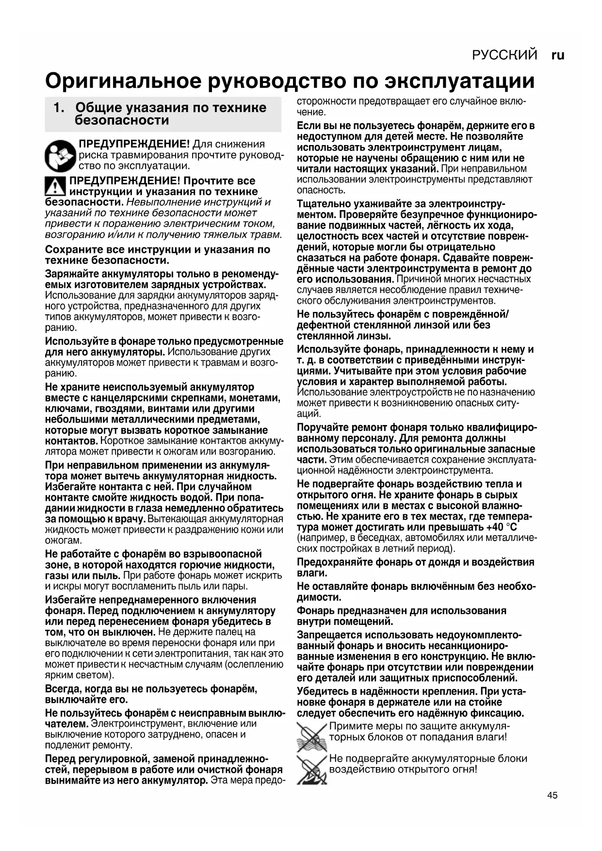 новке фонаря в держателе или на стойке следует обеспечить его надёжную фиксацию. Примите меры по защите аккумуля- торных блоков от попадания влаги! Не подвергайте аккумуляторные блоки воздействию открытого огня! Оригинальное руководство по эксплуатации
