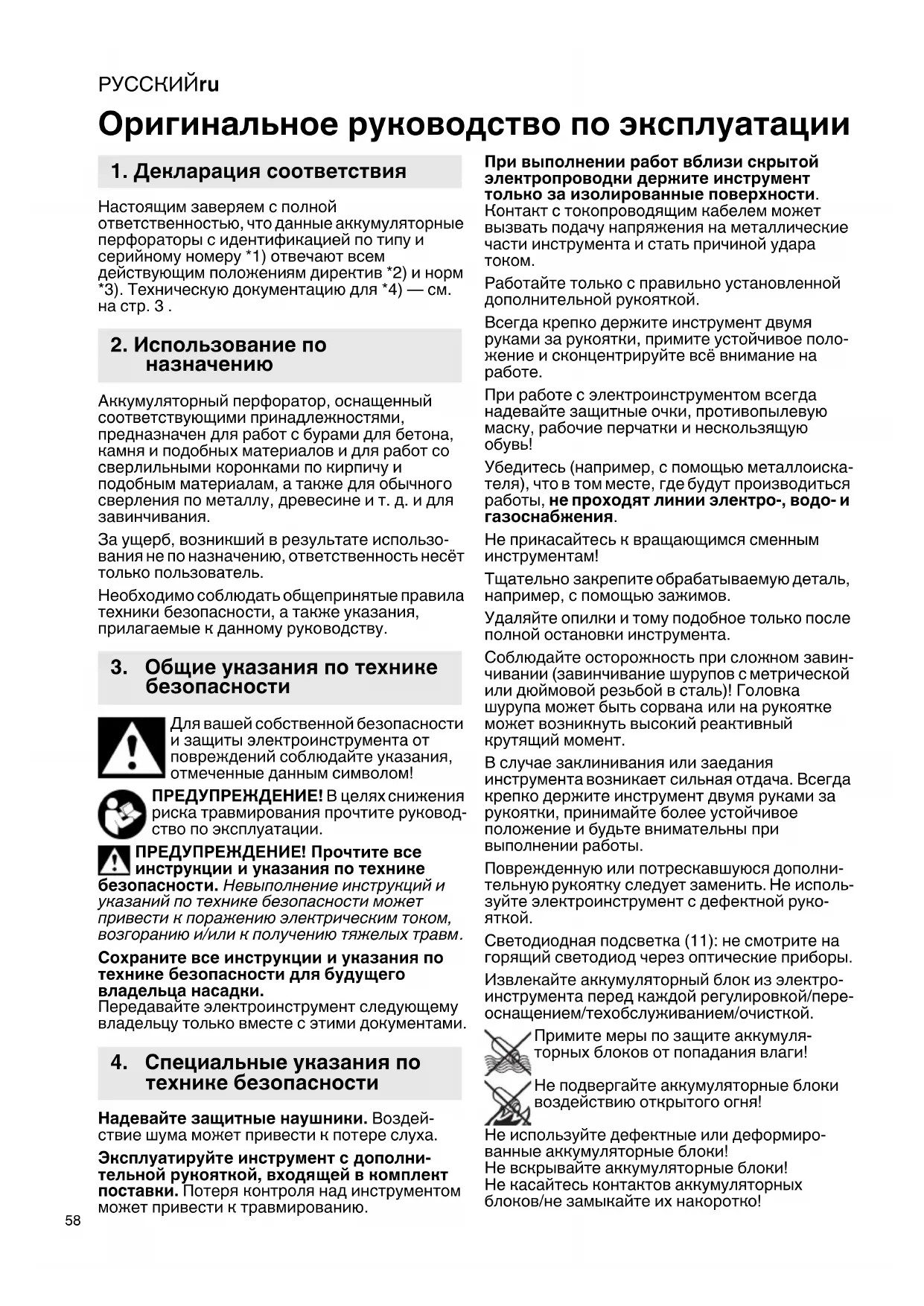 Настоящим заверяем с полной ответственностью, что данные аккумуляторные перфораторы с идентификацией по типу и серийному номеру *1) отвечают всем действующим положениям директив *2) и норм *3). Техническую документацию для *4) — см. на стр.3. Аккумуляторный перфоратор, оснащенный соответствующими принадлежностями, предназначен для работ с бурами для бетона, камня и подобных материалов и для работ со сверлильными коронками по кирпичу и подобным материалам, а также для обычного сверления по металлу, древесине и т. д. и для завинчивания. За ущерб, возникший в результате использо- вания не по назначению, ответственность несёт только пользователь. Необходимо соблюдать общепринятые правила техники безопасности, а также указания, прилагаемые к данному руководству. Для вашей собственной безопасности и защиты электроинструмента от повреждений соблюдайте указания, отмеченные данным символом! ПРЕДУПРЕЖДЕНИЕ! В целях снижения риска травмирования прочтите руковод- ство по эксплуатации. ПРЕДУПРЕЖДЕНИЕ! Прочтите все инструкции и указания по технике безопасности. Невыполнение инструкций и указаний по технике безопасности может привести к поражению электрическим током, возгоранию и/или к получению тяжелых травм