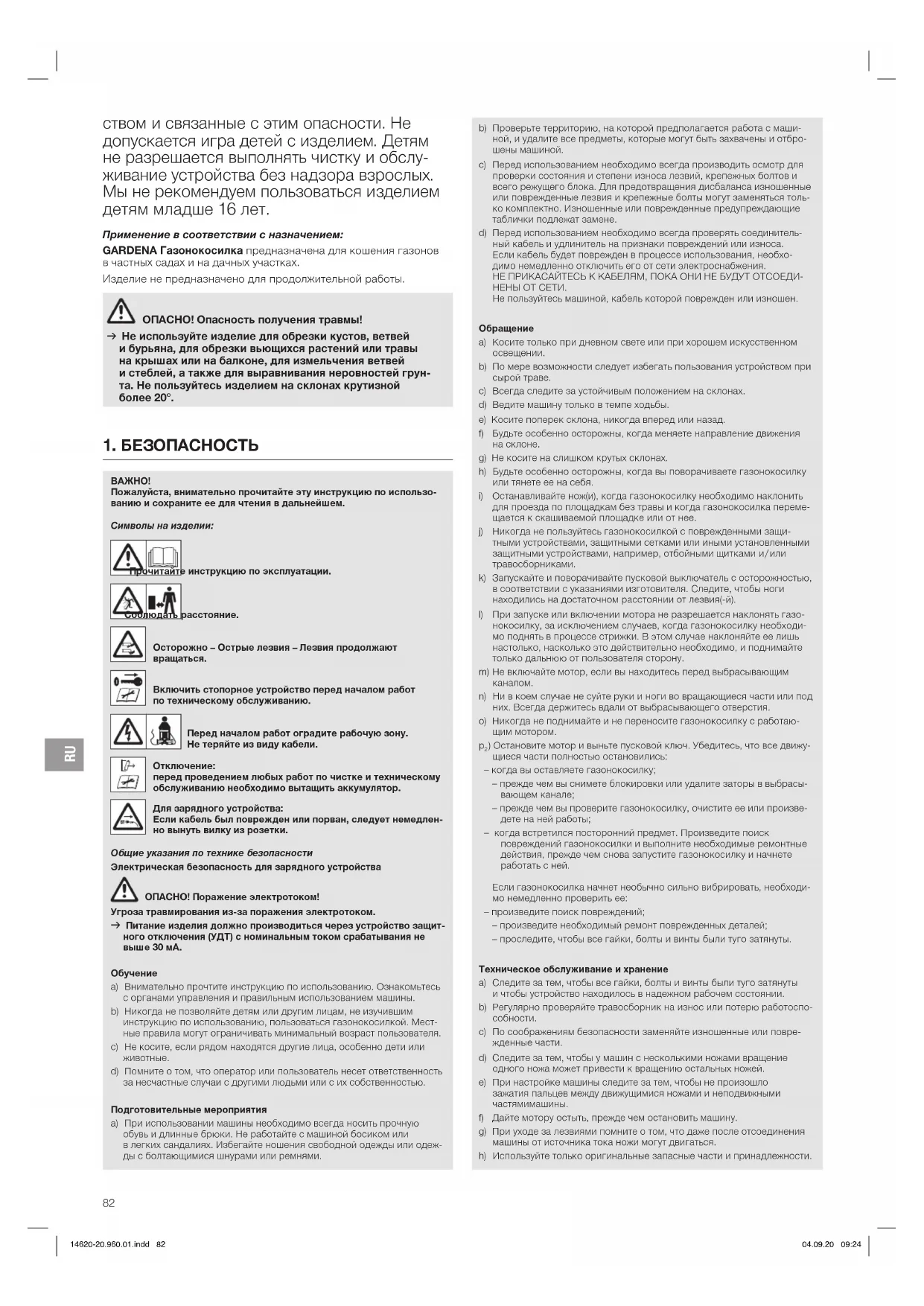 ством и связанные с этим опасности. Не допускается игра детей с изделием. Детям не разрешается выполнять чистку и обслу- живание устройства без надзора взрослых. Мы не рекомендуем пользоваться изделием детям младше 16 лет. Применение в соответствии с назначением: GARDENA Газонокосилка предназначена для кошения газонов в частных садах и на дачных участках. Изделие не предназначено для продолжительной работы. ОПАСНО! Опасность получения травмы! v Не используйте изделие для обрезки кустов, ветвей ибурьяна, для обрезки вьющихся растений или травы на крышах или на балконе, для измельчения ветвей и стеблей, а также для выравнивания неровностей грун- та.Не пользуйтесь изделием на склонах крутизной более 20°. 14620-20.960.01.indd 82 04.09.20 09:24RU