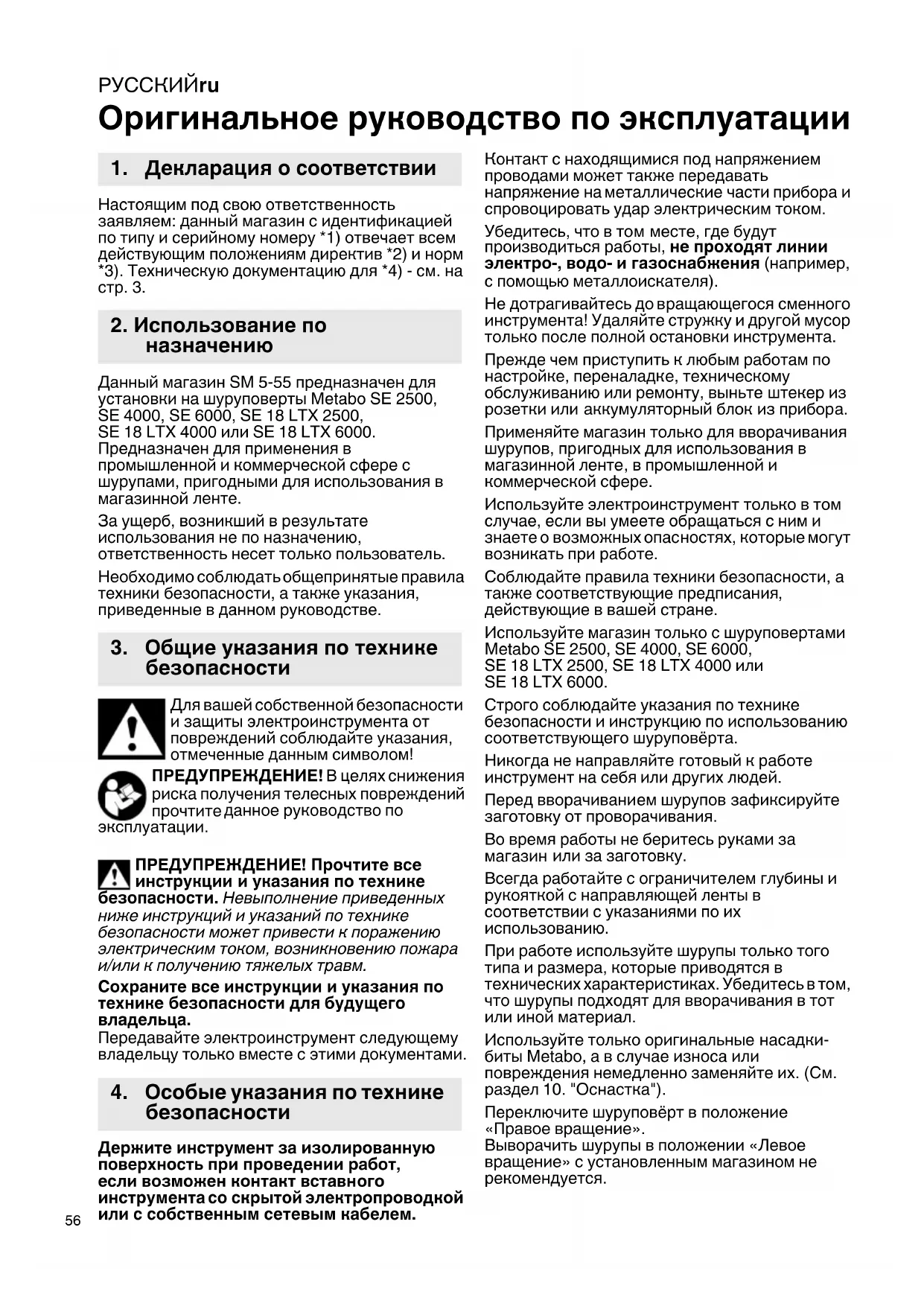 Оригинальное руководство по эксплуатации Настоящим под свою ответственность заявляем: данный магазин с идентификацией по типу и серийному номеру *1) отвечает всем действующим положениям директив *2) и норм *3). Техническую документацию для *4) - см. на стр. 3. Данный магазин SM 5-55 предназначен для установки на шуруповерты Metabo SE 2500, SE 4000, SE 6000, SE 18 LTX 2500, SE 18 LTX 4000 или SE 18 LTX 6000. Предназначен для применения в промышленной и коммерческой сфере с шурупами, пригодными для использования в