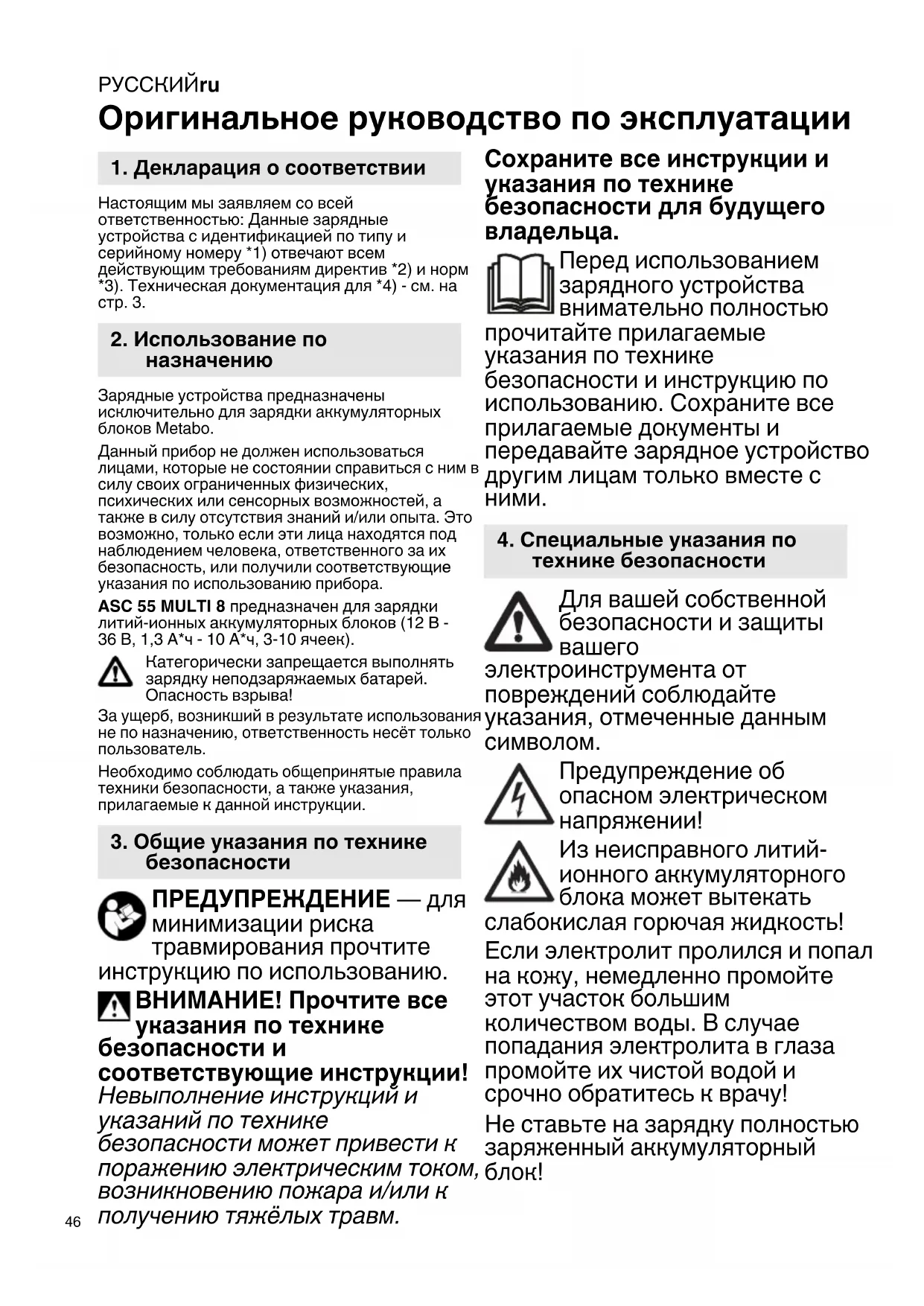 Оригинальное руководство по эксплуатации Настоящим мы заявляем со всей ответственностью: Данные зарядные устройства с идентификацией по типу и серийному номеру *1) отвечают всем действующим требованиям директив *2) и норм *3). Техническая документация для *4) - см. на стр. 3. Зарядные устройства предназначены исключительно для зарядки аккумуляторных блоков Metabo. Данный прибор не должен использоваться лицами, которые не состоянии справиться с ним в силу своих ограниченных физических, психических или сенсорных возможностей, а также в силу отсутствия знаний и/или опыта. Это возможно, только если эти лица находятся под наблюдением человека, ответственного за их безопасность, или получили соответствующие указания по использованию прибора. ASC 55 MULTI 8 предназначен для зарядки литий-ионных аккумуляторных блоков (12 В - 36 В, 1,3 A*ч - 10 A*ч, 3-10 ячеек). Категорически запрещается выполнять зарядку неподзаряжаемых батарей. Опасность взрыва! За ущерб, возникший в результате использования не по назначению, ответственность несёт только пользователь. Необходимо соблюдать общепринятые правила техники безопасности, а также указания, прилагаемые к данной инструкции. ПРЕДУПРЕЖДЕНИЕ — для минимизации риска травмирования прочтите инструкцию по использованию. ВНИМАНИЕ! Прочтите все указания по технике безопасности и соответствующие инструкции! Невыполнение инструкций и указаний по технике безопасности может привести к поражению электрическим током, возникновению пожара и/или к получению тяжёлых травм. Сохраните все инструкции и указания по технике безопасности для будущего
