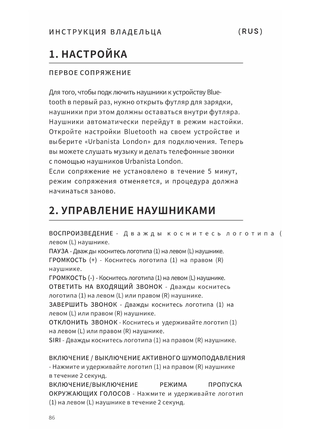 ГРОМКОСТЬ (-) - Коснитесь логотипа (1) на левом (L) наушнике. ОТВЕТИТЬ НА ВХОДЯЩИЙ ЗВОНОК - Дважды коснитесь логотипа (1) на левом (L) или правом (R) наушнике. ЗАВЕРШИТЬ ЗВОНОК - Дважды коснитесь логотипа (1) на левом (L) или правом (R) наушнике. ОТКЛОНИТЬ ЗВОНОК - Коснитесь и удерживайте логотип (1) на левом (L) или правом (R) наушнике. SIRI - Дважды коснитесь логотипа (1) на правом (R) наушнике. ВКЛЮЧЕНИЕ / ВЫКЛЮЧЕНИЕ АКТИВНОГО ШУМОПОДАВЛЕНИЯ - Нажмите и удерживайте логотип (1) на правом (R) наушнике в течение 2 секунд. ВКЛЮЧЕНИЕ/ВЫКЛЮЧЕНИЕ РЕЖИМА ПРОПУСКА ОКРУЖАЮЩИХ ГОЛОСОВ - Нажмите и удерживайте логотип (1) на левом (L) наушнике в течение 2 секунд. ИНСТРУКЦИЯ ВЛАДЕЛЬЦА (RUS)87