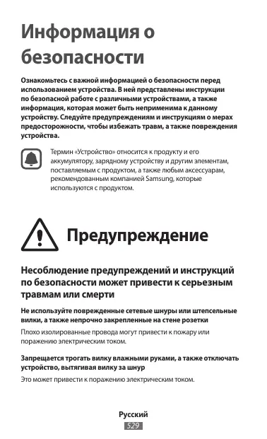 Информация о безопасности Ознакомьтесь с важной информацией о безопасности перед использованием устройства. В ней представлены инструкции по безопасной работе с различными устройствами, а также информация, которая может быть неприменима к данному устройству. Следуйте предупреждениям и инструкциям о мерах предосторожности, чтобы избежать травм, а также повреждения устройства. Термин «Устройство» относится к продукту и его аккумулятору, зарядному устройству и другим элементам, поставляемым с продуктом, а также любым аксессуарам, рекомендованным компанией Samsung, которые используются с продуктом. Предупреждение Несоблюдение предупреждений и инструкций по безопасности может привести к серьезным травмам или смерти Не используйте поврежденные сетевые шнуры или штепсельные вилки, а также непрочно закрепленные на стене розетки Плохо изолированные провода могут привести к пожару или поражению электрическим током. Запрещается трогать вилку влажными руками, а также отключать устройство, вытягивая вилку за шнур Это может привести к поражению электрическим током.