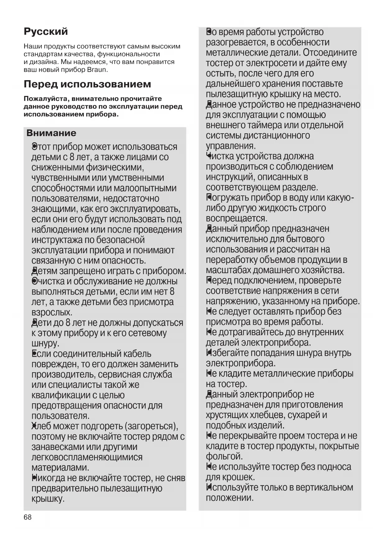 «Делонги» ААҚ, Ресей, 127055, Москва каласы, Сущёвская көшесі, 27/3-үй (27-үй, 3-кұрылым) Тел. +7 (495) 781-26-76 67Русский Наши продукты соответствуют самым высоким стандартам качества, функциональности и дизайна. Мы надеемся, что вам понравится ваш новый прибор Braun. Перед использованием Пожалуйста, внимательно прочитайте данное руководство по эксплуатации перед использованием прибора.