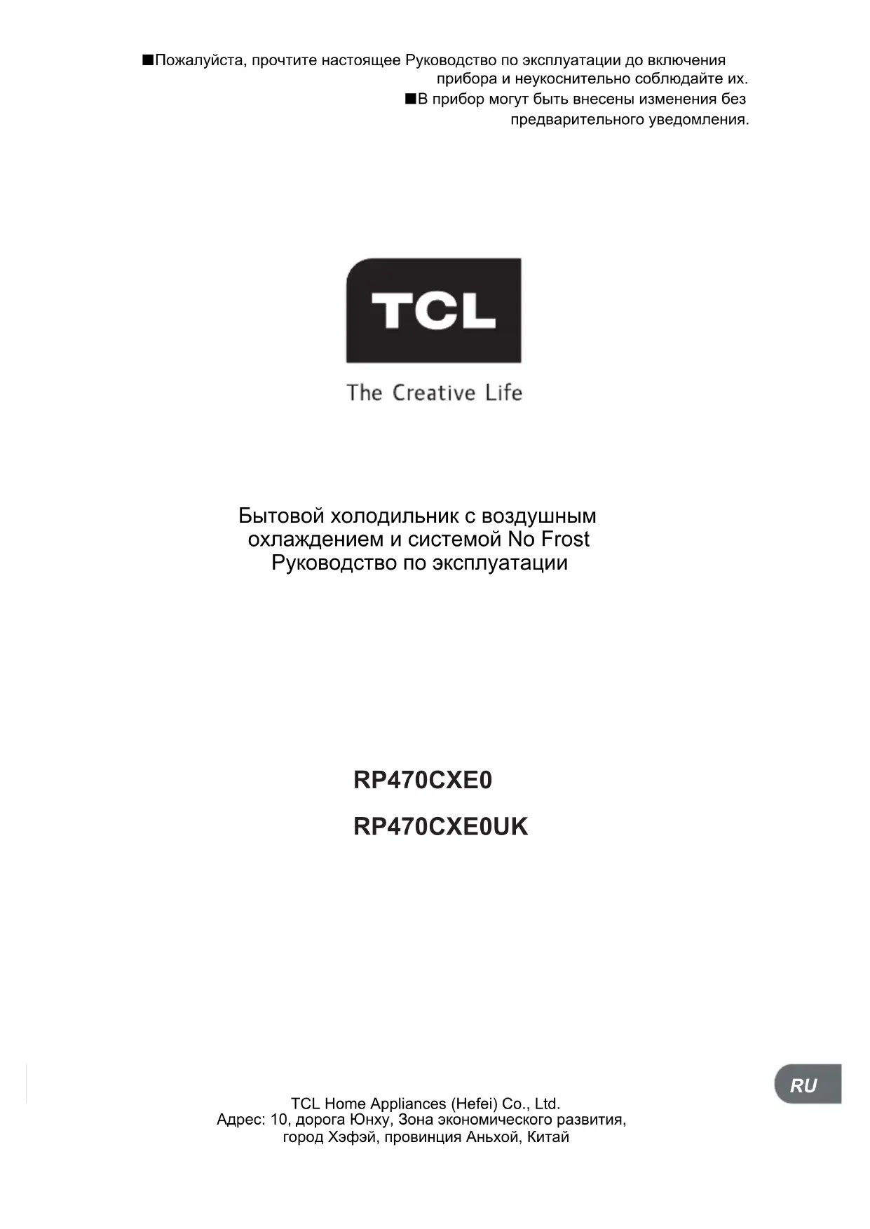 Бытовой холодильник с воздушным охлаждением и системой No Frost Руководство по эксплуатации TCL Home Appliances (Hefei) Co., Ltd. Адрес: 10, дорога Юнху, Зона экономического развития, город Хэфэй, провинция Аньхой, Китай