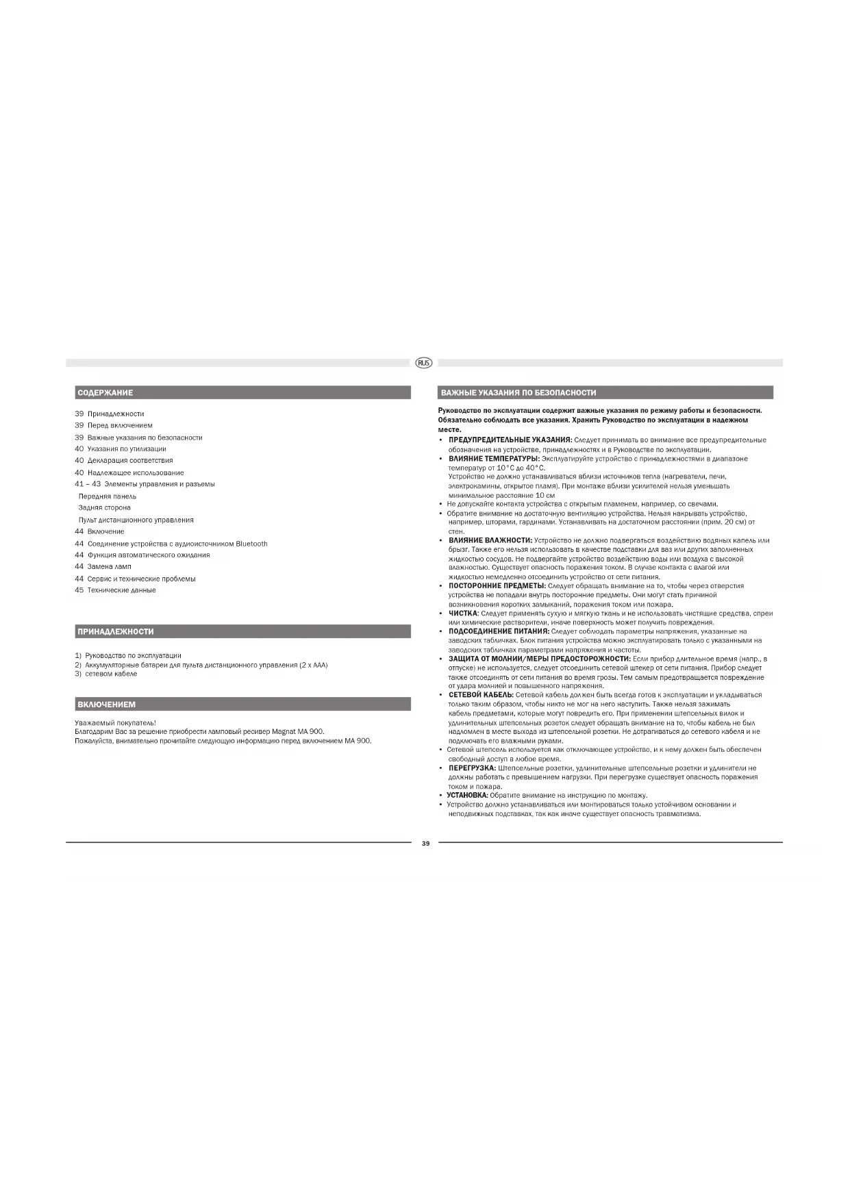 - Устройство должно устанавливаться или монтироваться только устойчивом основании и неподвижных подставках, так как иначе существует опасность травматизма.40 Этот символ предупреждает пользователя о том, что внутри устройства используется высокое напряжение, которое может привести к опасным ударам тока. Этот символ указывает пользователю устройства на то, что в прилагаемом руководстве по эксплуатации имеются важные указания, которым обязательно нужно следовать. Не открывать! Опасность электрического удара! Чтобы уменьшить опасность возгорания или электрического удара, необходимо защищать устройство от дождя или влаги. Устройство класса защиты II с двойной изоляцией. Контакт защитного заземления отсутствует. УКАЗАНИЯ ПО УТИЛИЗАЦИИ Согласно европейской директиве 2012/19/EU все электрические и электронные приборы для утилизации должны сдаваться отдельно в местные сборные пункты. Пожалуйста, выполняйте местные предписания и не выбрасывайте старые устройства вместе с обычным домашним мусором. Утилизация батареек Старые батарейки относятся к особым отходам и подлежат утилизации согласно действующим предписаниям. ДЕКЛАРАЦИЯ СООТВЕТСТВИЯ Данным компания Magnat Audio-Produkte GmbH удостоверяет, что устройство MA 900 отвечает основным требованиям и другим релевантным нормам Директивы 2014/53/EU. Декларация соответствия находится на сайте www.magnat.de в разделе Downloads (материалы для скачивания) каждого устройства.. НАДЛЕЖАЩЕЕ ИСПОЛЬЗОВАНИЕ Это устройство предназначено только для домашнего использования.