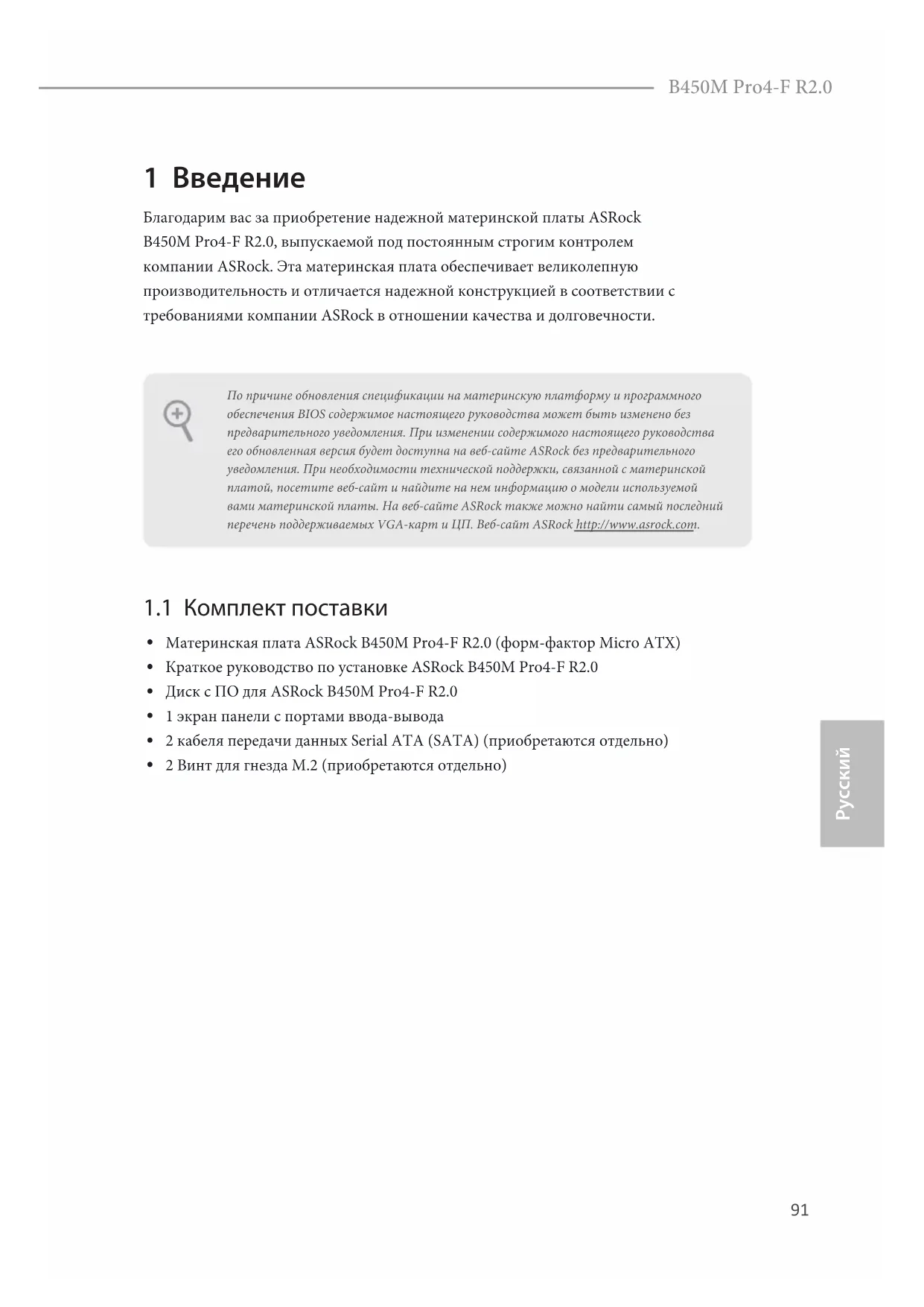 B450M Pro4-F R2.0 1 Введение Благодарим вас за приобретение надежной материнской платы ASRock B450M Pro4-F R2.0, выпускаемой под постоянным строгим контролем компании ASRock. Эта материнская плата обеспечивает великолепную производительность и отличается надежной конструкцией в соответствии с требованиями компании ASRock в отношении качества и долговечности.