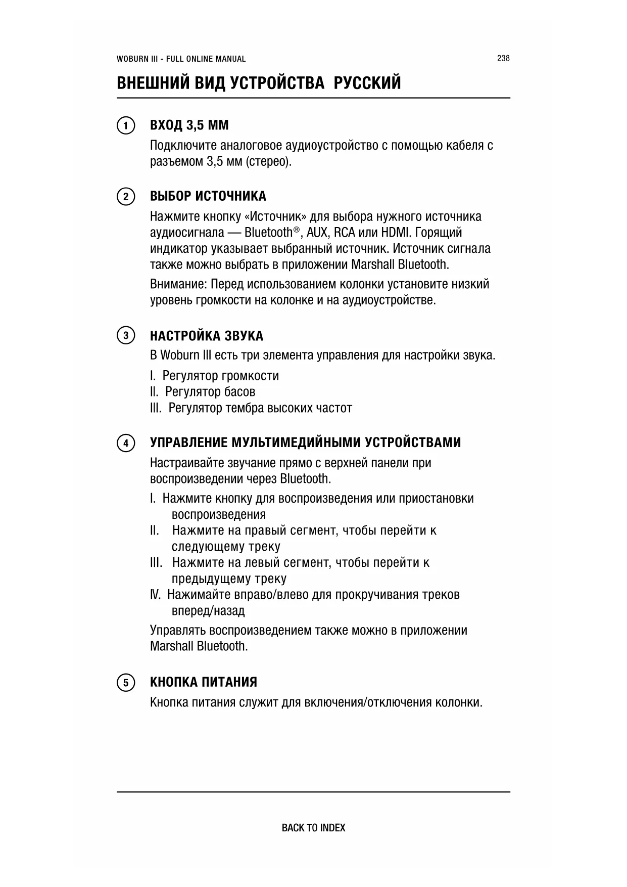Используйте входящий в комплект шнур питания для подключения Woburn III к розетке. ВНЕШНИЙ ВИД УСТРОЙСТВА PУССКИЙ240