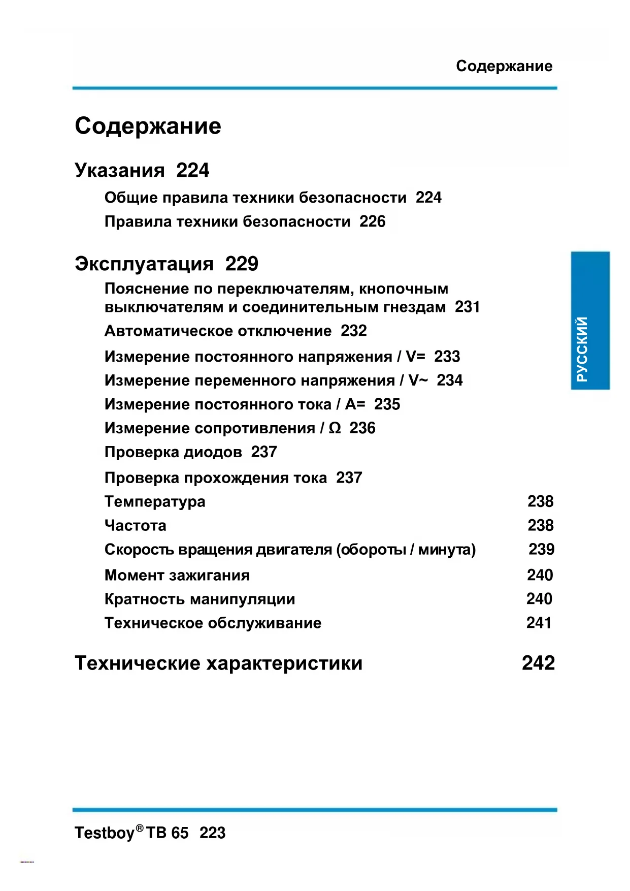 Указания 224 Общие правила техники безопасности 224 Правила техники безопасности 226 Эксплуатация 229 Пояснение по переключателям, кнопочным выключателям и соединительным гнездам 231 Автоматическое отключение 232 Измерение постоянного напряжения / V= 233 Измерение переменного напряжения / V~ 234 Измерение постоянного тока / A= 235 Измерение сопротивления / Ω 236 Проверка диодов 237 Проверка прохождения тока 237 Температура 238 Частота 238 Скорость вращения двигателя (обороты / минута) 239 Момент зажигания 240 Кратность манипуляции 240 Техническое обслуживание 241 Технические характеристики 242Указания
