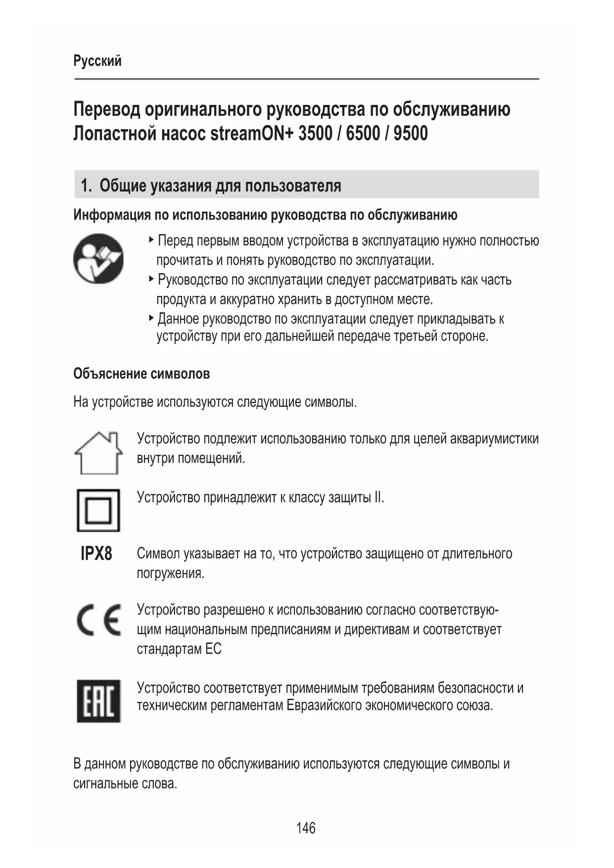 Информация по использованию руководства по обслуживанию ▶ Перед первым вводом устройства в эксплуатацию нужно полностью прочитать и понять руководство по эксплуатации. ▶ Руководство по эксплуатации следует рассматривать как часть продукта и аккуратно хранить в доступном месте. ▶ Данное руководство по эксплуатации следует прикладывать к устройству при его дальнейшей передаче третьей стороне. Объяснение символов На устройстве используются следующие символы. Устройство подлежит использованию только для целей аквариумистики внутри помещений. Устройство принадлежит к классу защиты II. Символ указывает на то, что устройство защищено от длительного погружения. Устройство разрешено к использованию согласно соответствую- щим национальным предписаниям и директивам и соответствует стандартам ЕС Устройство соответствует применимым требованиям безопасности и техническим регламентам Евразийского экономического союза. В данном руководстве по обслуживанию используются следующие символы и сигнальные слова. IPX8Русский