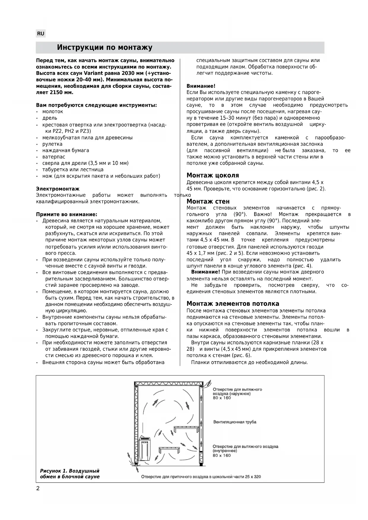 Инструкции по монтажу Перед тем, как начать монтаж сауны, внимательно ознакомьтесь со всеми инструкциями по монтажу. Высота всех саун Variant равна 2030 мм (+устано- вочные ножки 20–40 мм). Минимальная высота по- мещения, необходимая для сборки сауны, состав- ляет 2150 мм. Вам потребуются следующие инструменты: